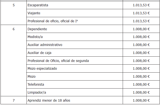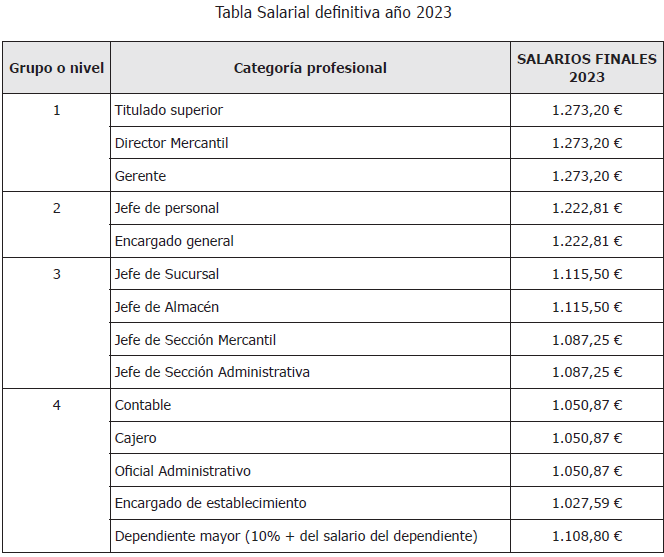 Punto 1. Una vez constatada oficialmente por el INE la inflación correspondiente al año 2023, y quedando establecida dicha cifra en el 3,1 % en aplicación del articulo 7.º del Convenio vigente se procede a la revisión del 3 % sobre los salarios del 2022, según el procedimiento establecido en el mismo y teniendo dicho incremento efectos retroactivos al 01 de enero de 2023, quedando la tabla salarial definitiva del año 2023 como a continuación se indica.