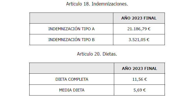 Punto 2. Igualmente y con los mismos criterios detallados en el punto anterior, se procede a revisar las cuantías relativas a indemnizaciones (artículo 18) y dietas (artículo 20) para el ejercicio 2023.