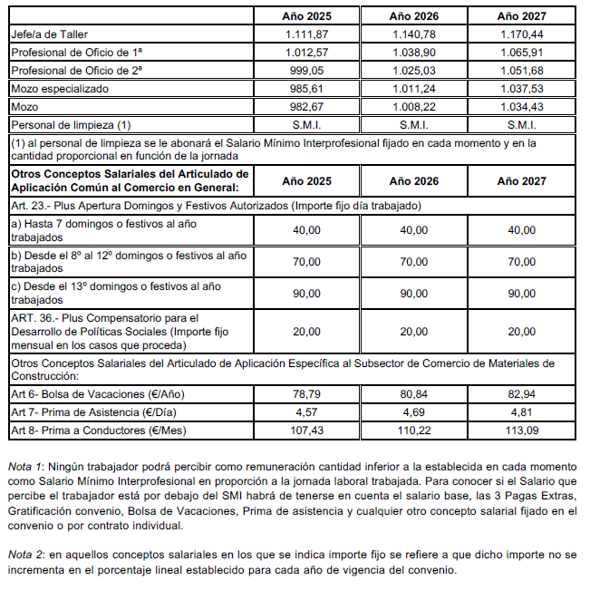 ANEXO III.- Subsector Comercio de Materiales de Construcción. Tablas Salariales Años 2025, 2026 y 2027.
