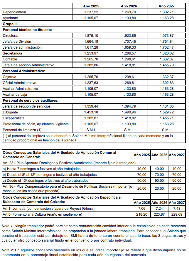 ANEXO II.- Subsector de Comercio del Calzado. Tablas Salariales Años 2025, 2026 y 2027.