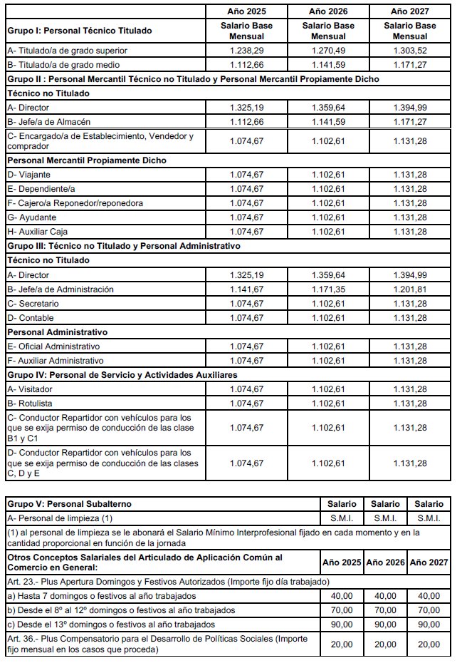 ANEXO VI.- Subsector de Comercio Textil. Tablas Salariales Años 2025, 2026 y 2027.