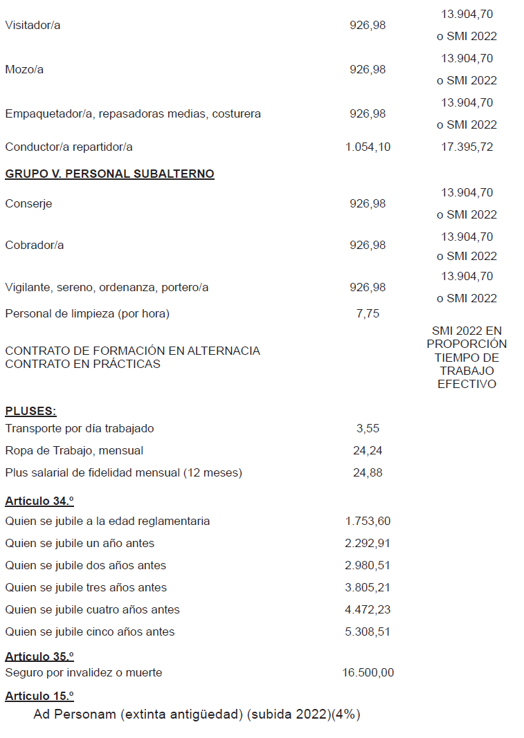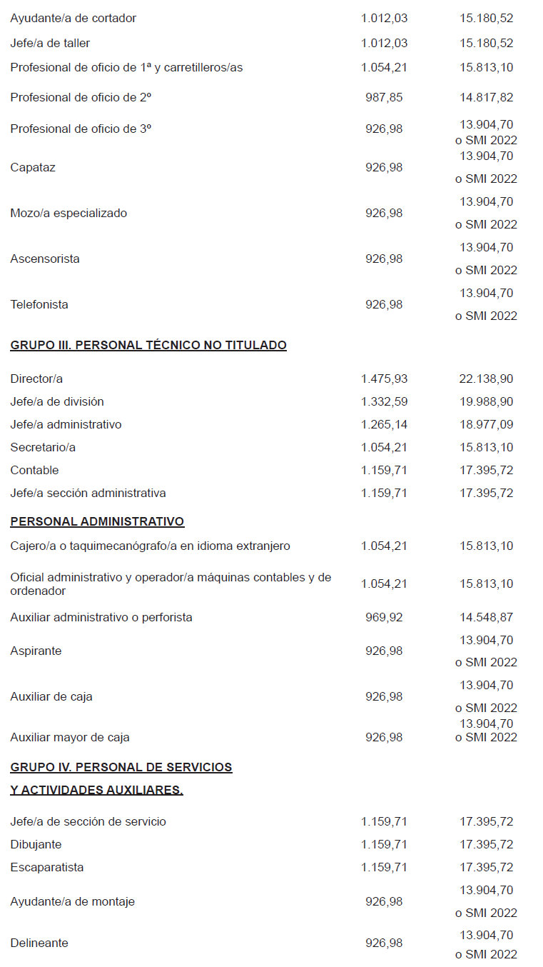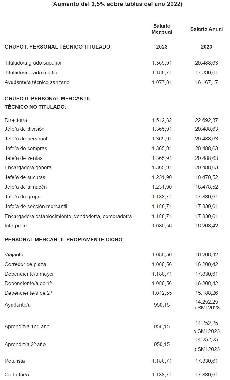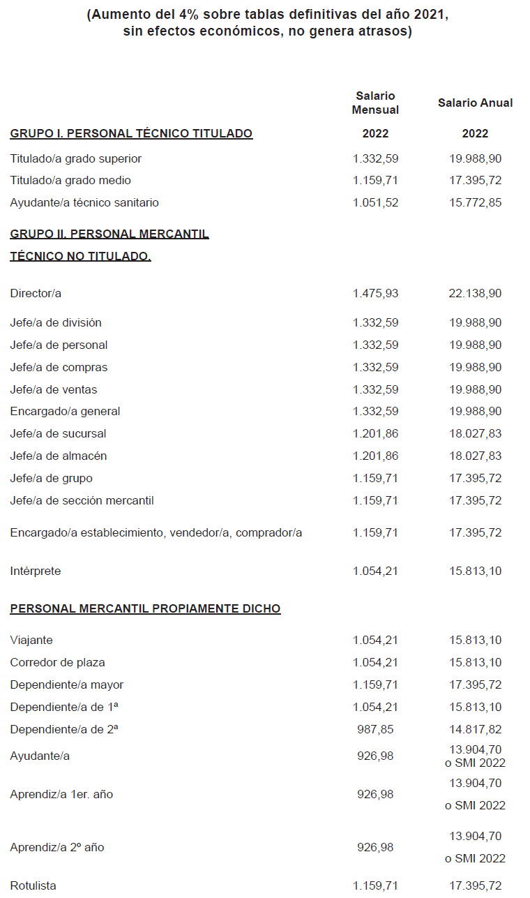 Para 2022, se acuerda un incremento de un 4 % sobre las Tablas Salariales definitivas para 2021 (BOP n.162 de 18 de julio de 2022) con efectos informativos y sin efectos económicos, que no generan derecho alguno a la percepción de atrasos. Se adjuntan como Anexo I, Anexo II. Tabla del año 2023: incremento del 2,5% sobre las tablas de 2022 .