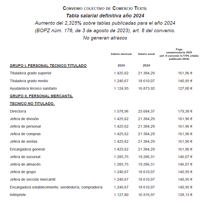 Vistos el acta y las tablas salariales definitivas para el año 2024, referidas al convenio colectivo del sector Comercio Textil de Zaragoza (código de convenio 50000305011982), suscrita el día 20 de junio de 2025, de una parte por Asociación de Empresarios de Comercio Textil de Zaragoza y Federación de Empresarios de Comercio y Servicios de Zaragoza, en representación de las empresas del sector y de otra parte por CC.OO., OSTA y MIT, en representación de los trabajadores afectados, recibida en la Subdirección Provincial de Trabajo el día 4 de julio de 2025, requerida subsanación y presentada el 15 de septiembre de 2025, y de conformidad con lo dispuesto en el artículo 90.2 y 3 del Estatuto de los Trabajadores y Real Decreto 713/2010 de 28 de mayo, sobre registro y depósito de convenios y acuerdos colectivos de trabajo, Esta Subdirección Provincial de Trabajo de Zaragoza acuerda: