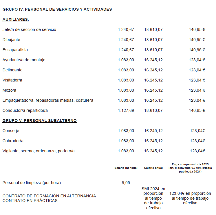 Cuarto. – Se adjunta a la presente acta la tabla definitiva de 2024; incorporando en columna anexa el importe de la paga compensatoria para cada uno de los grupos y categorías profesionales.