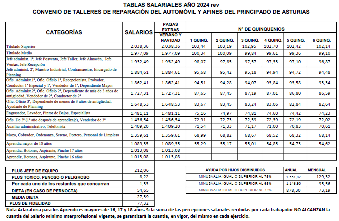 Visto el acta de la Comisión Negociadora del convenio colectivo de sector Compraventa y/o Reparación del Automóvil, Reparación y Venta de Motocicletas del Principado de Asturias (expediente C-034/2024 código 33001115011982), recibido a través de medios electrónicos ante el Registro de convenios colectivos, acuerdos colectivos de trabajo y planes de igualdad del Principado de Asturias el 30 de abril de 2025, en la que se acuerda la tabla salarial definitiva para el año 2024 y la tabla salarial para el año 2025, y de conformidad con lo dispuesto en el art. 90, números 2 y 3 del Real Decreto Legislativo 2/2015, de 23 de octubre, por el que se aprueba el texto refundido de la Ley del Estatuto de los Trabajadores; y en el Real Decreto 713/2010, de 28 de mayo, sobre registro y depósito de convenios colectivos, acuerdos colectivos de trabajo y planes de igualdad y en el Decreto 23/2025, de 16 de abril, del Presidente de Principado de Asturias, de quinta modificación del Decreto 22/2023, de 31 de julio, de reestructuración de Consejerías que integran la Administración de la Comunidad Autónoma, corresponden a la Consejería de Ciencia, Industria y Empleo las competencias en materia de coordinación de las relaciones laborales, la Dirección General existente mantendrá su denominación y competencias, bajo la dependencia orgánica resultante del citado Decreto. Asimismo, continúa vigente la delegación de competencias otorgada en su día en virtud de Resolución de 3 de octubre de 2023, hasta que sea expresamente revocada o nuevamente otorgada. Por ello, se entiende que el órgano competente para emitir la presente resolución es la titular de la Dirección General de Empleo y Asuntos Laborales por delegación autorizada en su día,