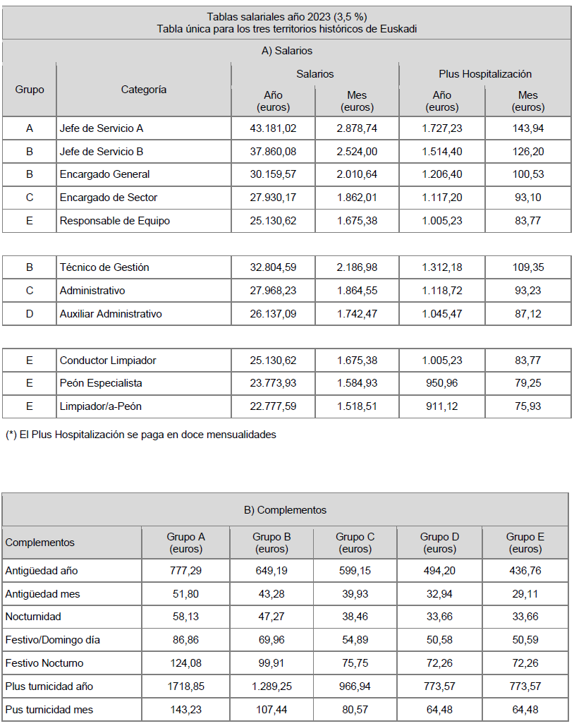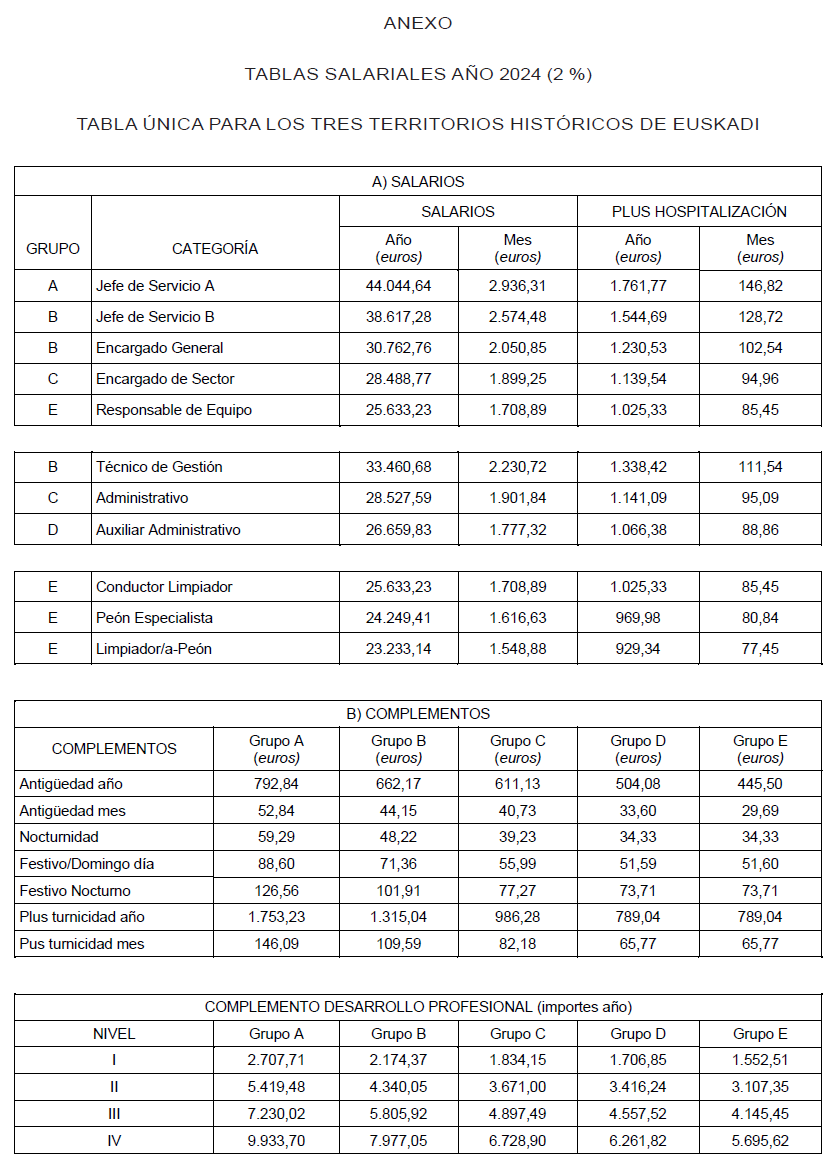 «Se aprueban las tablas salariales del Convenio Colectivo para las empresas concesionarias del servicio de limpieza de Osakidetza que, firmadas, se adjuntan como anexo a la presente acta, en las que se efectúa la actualización de los conceptos salariales en un 2 % respecto de las vigentes a fecha 31 de diciembre de 2023, con efectos desde el 1 de enero de 2024, de conformidad con los términos previstos en la Ley 21/2023, de 22 de diciembre, por la que se aprueban los Presupuestos Generales de la Comunidad Autónoma de Euskadi para el ejercicio 2024 y en la Resolución 83/2024, de 31 de julio, de la Directora de la Secretaría del Gobierno y de Relaciones con el Parlamento, por la que se dispone la publicación del Acuerdo por el que se aprueba el incremento, para el año 2024, de las retribuciones del personal al servicio del sector público de la Administración de la Comunidad Autónoma de Euskadi.