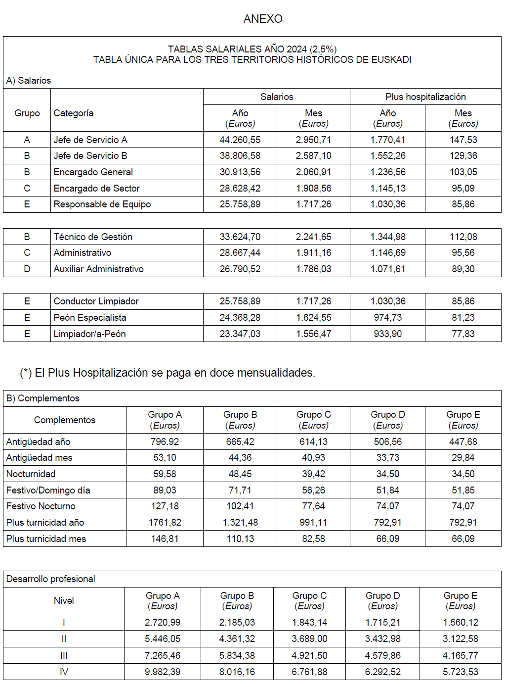 Se aprueban las tablas salariales del Convenio Colectivo para las Empresas Concesionarias del Servicio de Limpieza de Osakidetza que, firmadas, se adjuntan como anexo a la presente acta, en las que se efectúa la actualización de los conceptos salariales en un 0,5 % adicional con efectos desde el 1 de enero de 2024, que se suma al aumento del 2 % aprobado anteriormente, lo que supone un incremento total de 2,5 % respecto de las vigentes a fecha 31 de diciembre de 2023, de conformidad con los términos previstos en la Resolución 69/2025, de 22 de julio, del Director de la Secretaría del Gobierno y de Relaciones con el Parlamento, por la que se dispone la publicación del Acuerdo por el que se aprueba el incremento adicional del 0,5 % para el año 2024, de las retribuciones del personal al servicio del sector público de la Comunidad Autónoma de Euskadi.