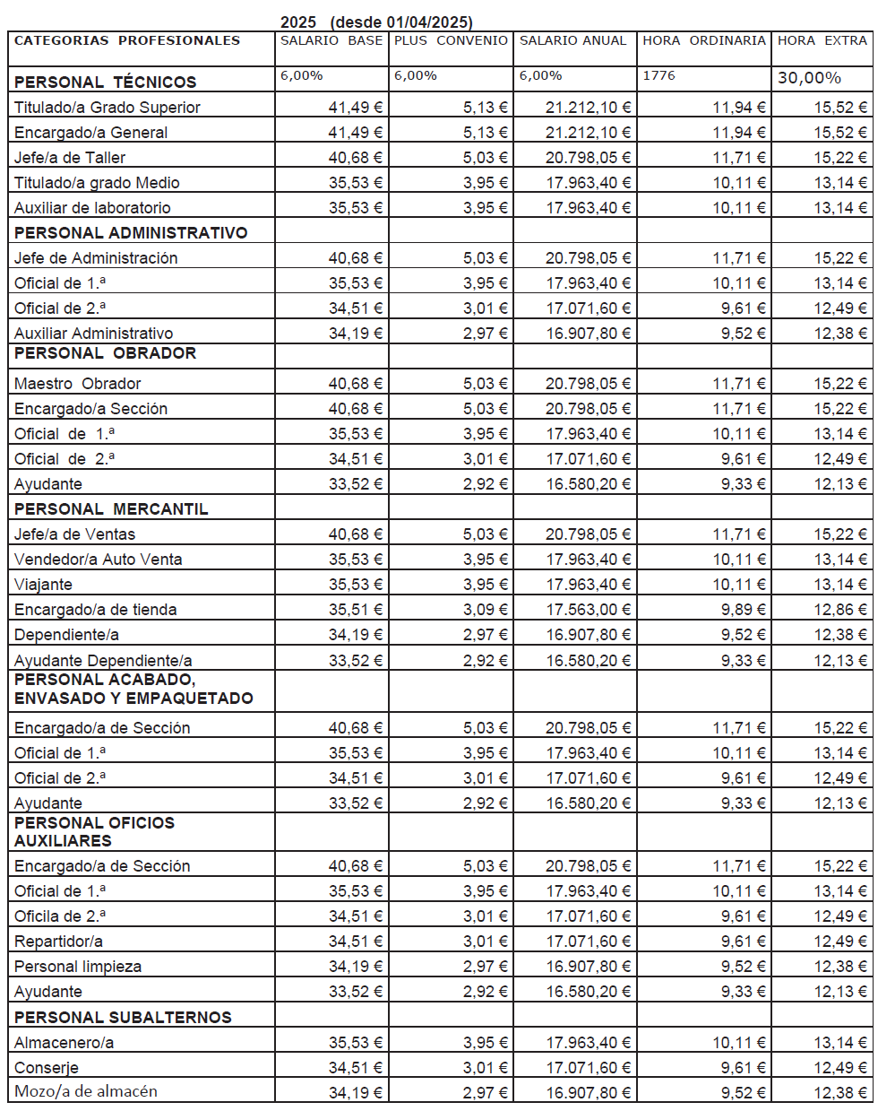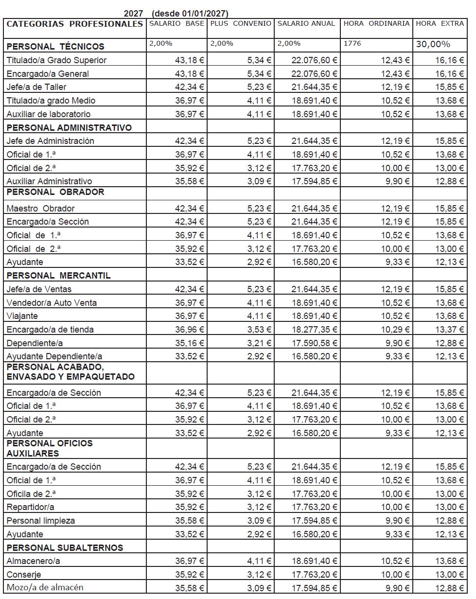 – Encargado/a de Sección, Oficial 1.ª, Oficial 2.ª, Repartidor/a, Ayudante y personal de limpieza.