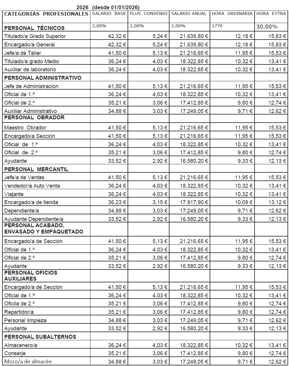 – Maestro/a Obrador, Encargado/a de sección, Oficial 1. ª, Oficial 2. ª y Ayudante.