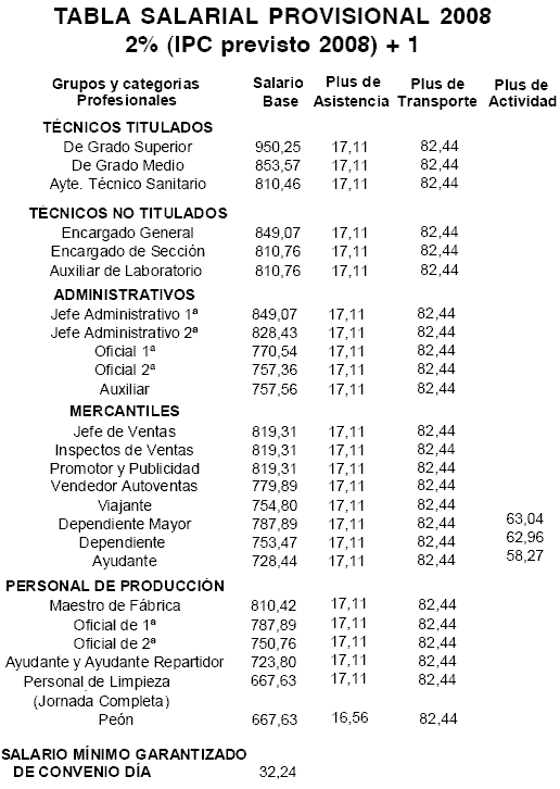 Con efectos de 1 de enero de 2008, todos los conceptos económicos, y las Tablas Salariales del año anterior (La Tabla Salarial definitiva de 2006 más el IPC real del año 2.007, 4.2%), serán incrementados en el I.P.C. previsto por el Gobierno para el año 2008, mas 1 punto.