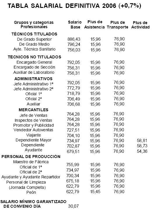 Primero. Efectuar una revisión de todos los conceptos económicos contemplados en el texto del Convenio Colectivo correspondiente al año 2.006, consistente en un 0.7 % diferencia existente entre el IPC previsto para el año 2.006 y el IPC real habido a 31 de diciembre del mismo y que dicho incremento sea de aplicación desde el 01 de enero a 31 de diciembre de 2.006. Se acompañan como anexos las tablas salariales correspondientes al año 2.006 (incluyendo la revisión del 0.7 %).