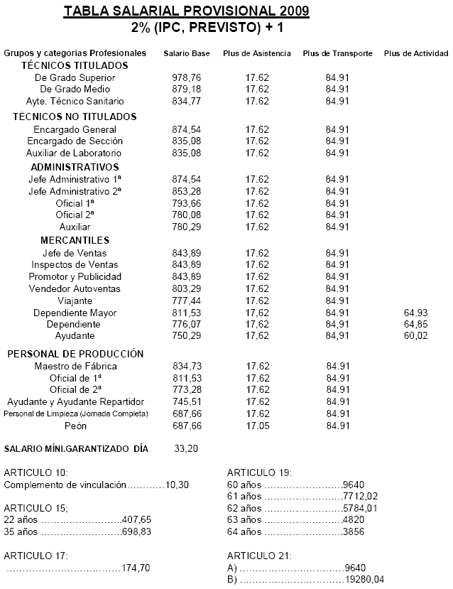 Con efectos de 1 de enero de 2009, todos los conceptos económicos y las Tablas Salariales de año anterior, serán incrementadas en el IPC previsto por el Gobierno para el año 2009 mas 1 punto.