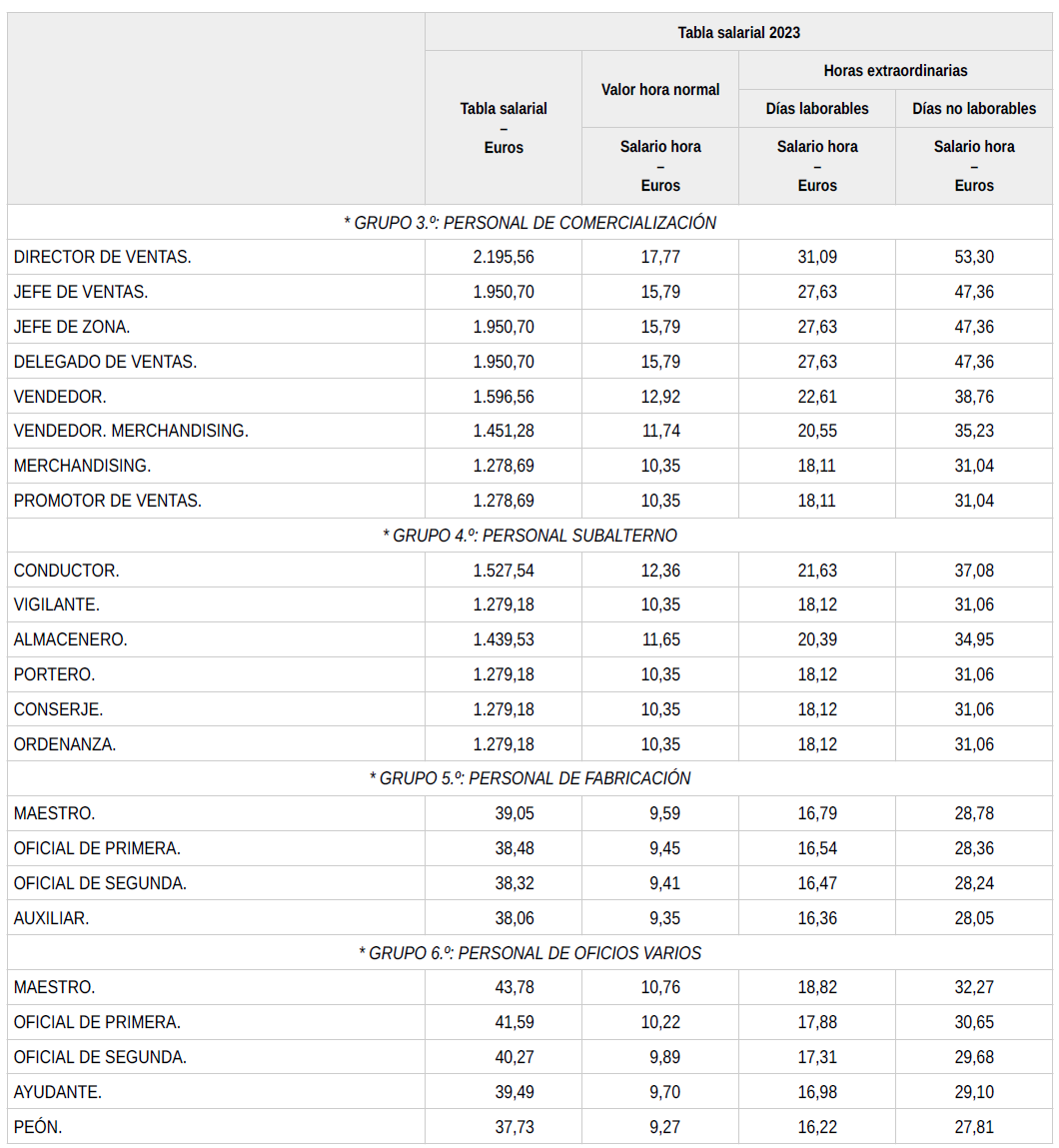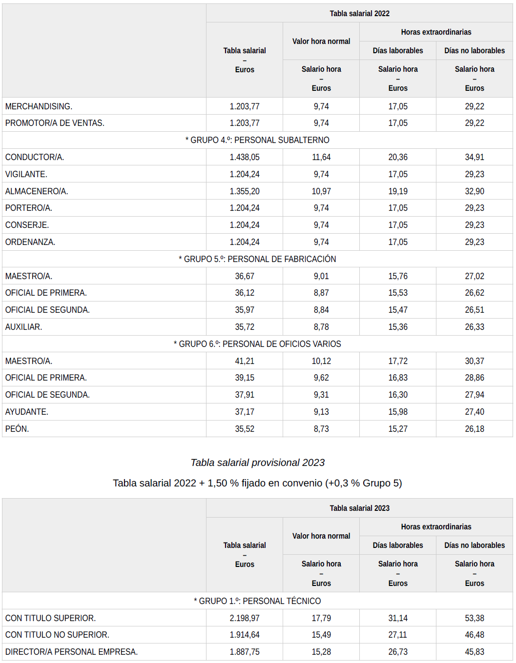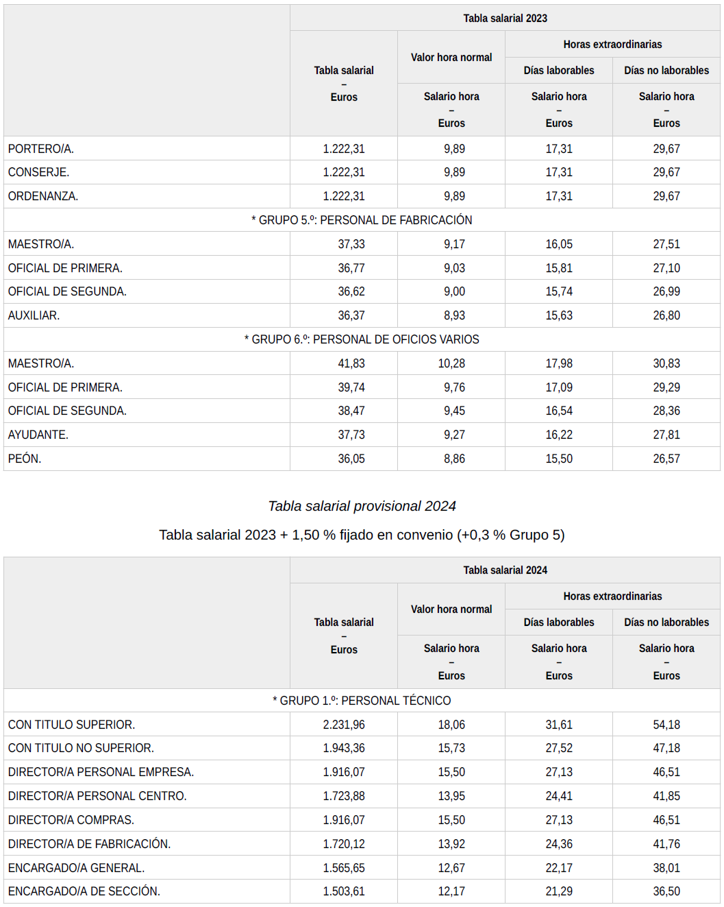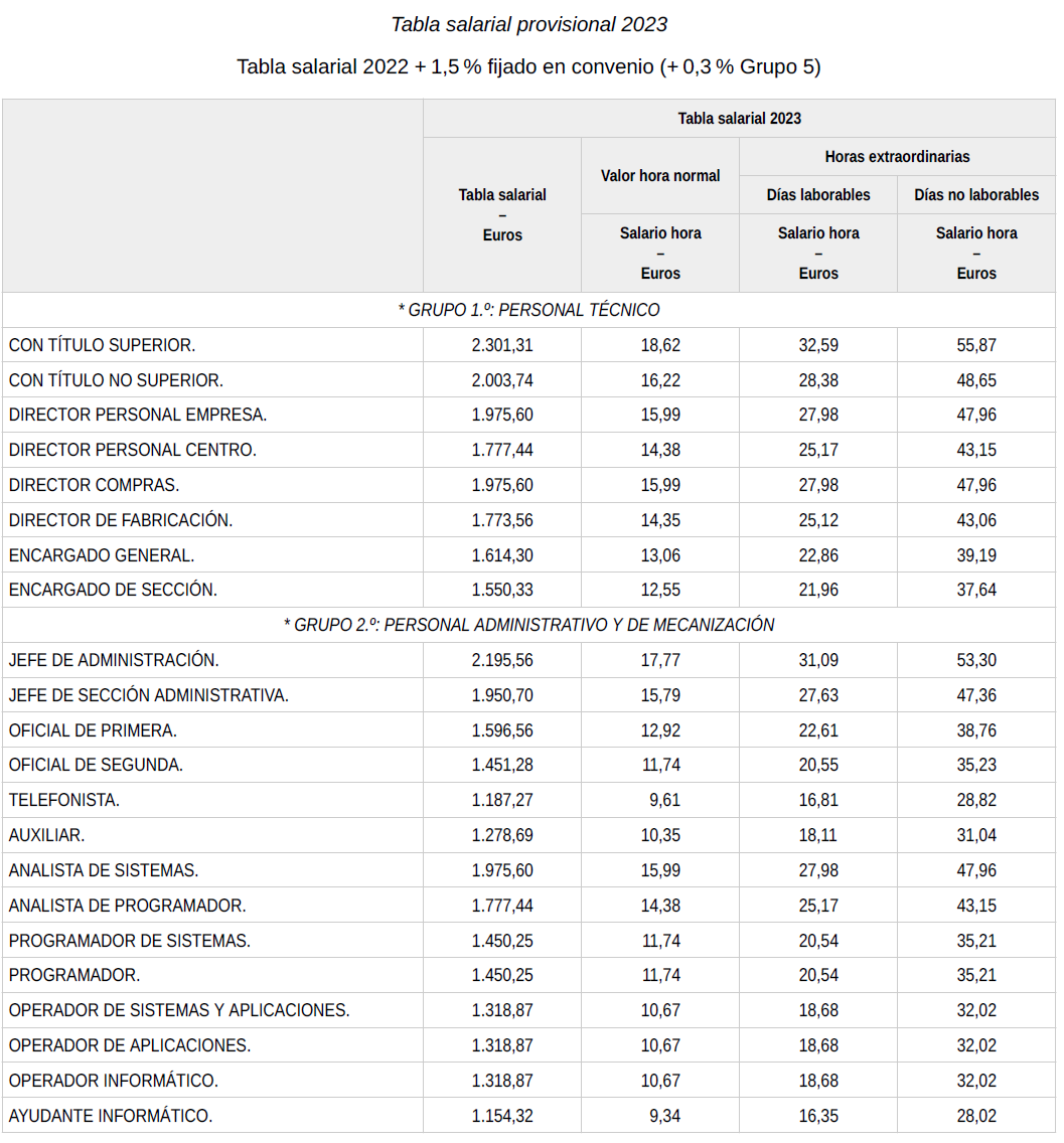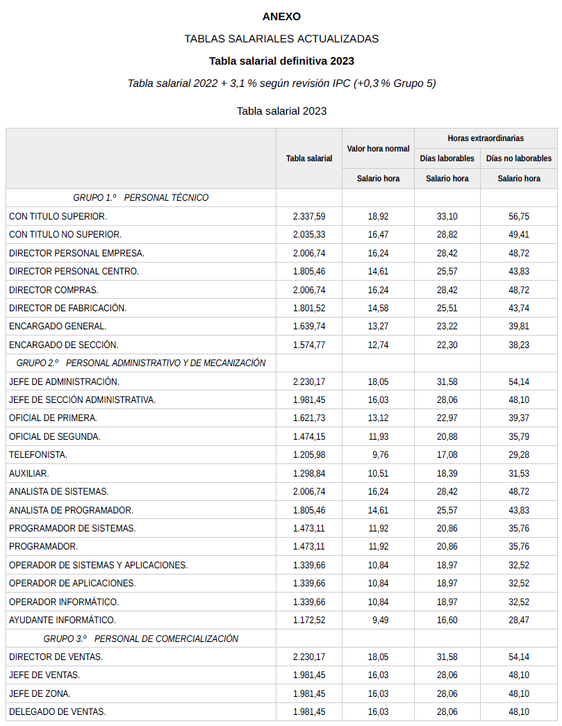 En base a lo anterior, se procede a revisar, aprobar y firmar las tablas salariales definitivas para el año 2023, así como la nueva tabla salarial provisional para el año 2024, que se incorporan a la presente acta. Dichas tablas salariales, ya incluyen aplicado el +0,3?% adicional correspondiente al grupo 5.