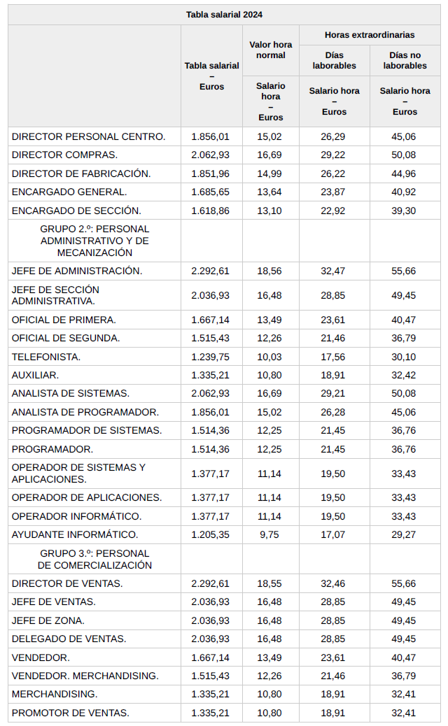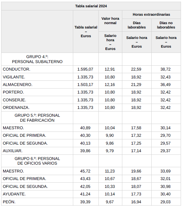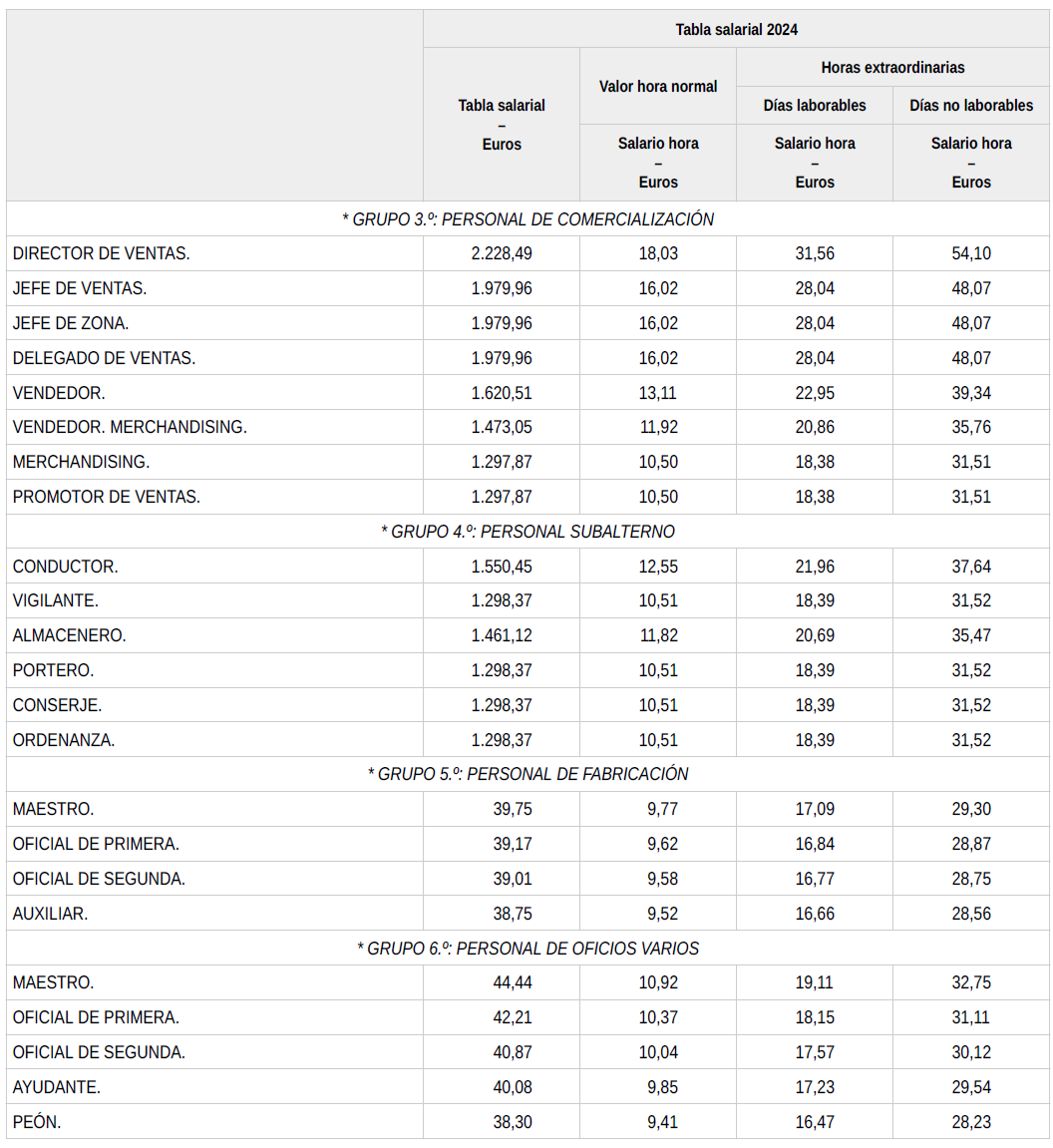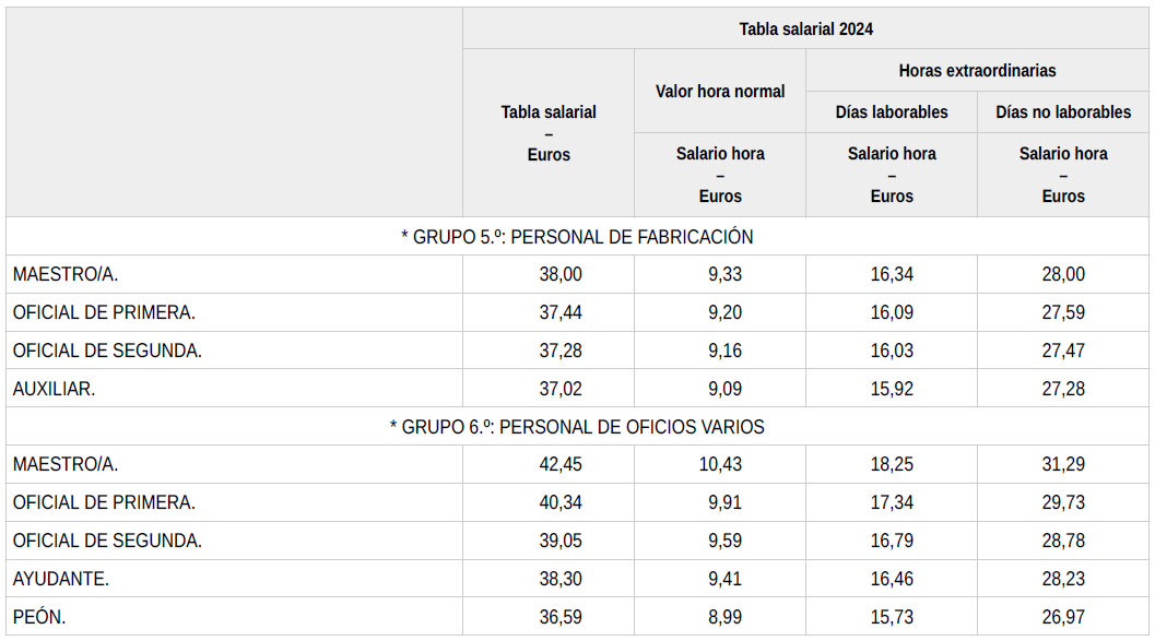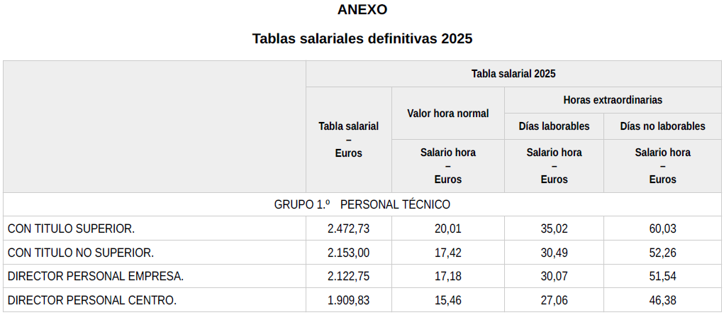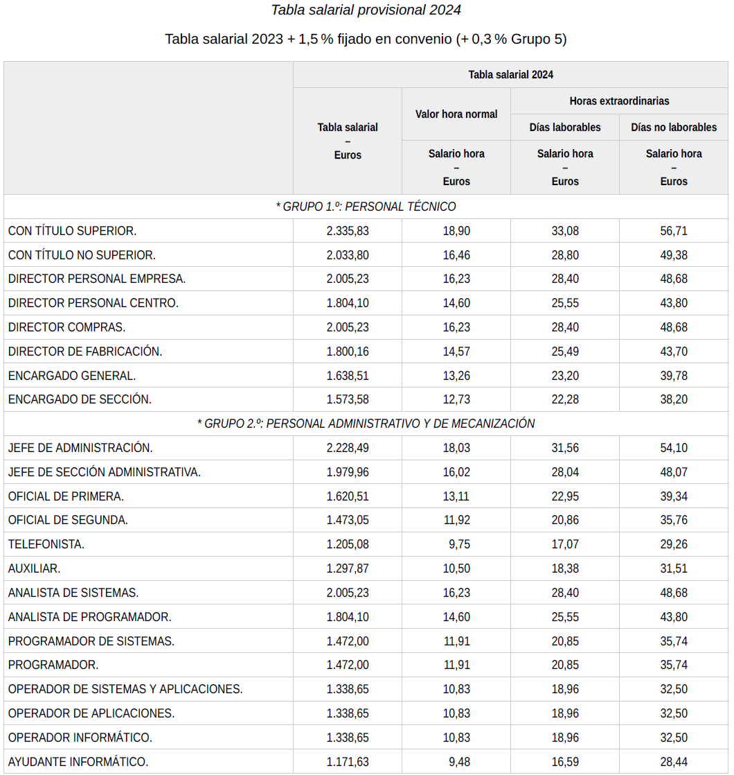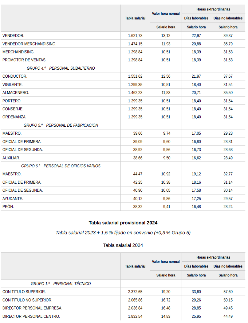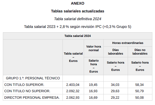 En base a lo anterior, se procede a revisar, aprobar y firmar las tablas salariales definitivas para el año 2024 y que se incorporan a la presente acta. Dichas tablas salariales ya incluyen aplicado el +0,3 % adicional correspondiente al grupo 5.