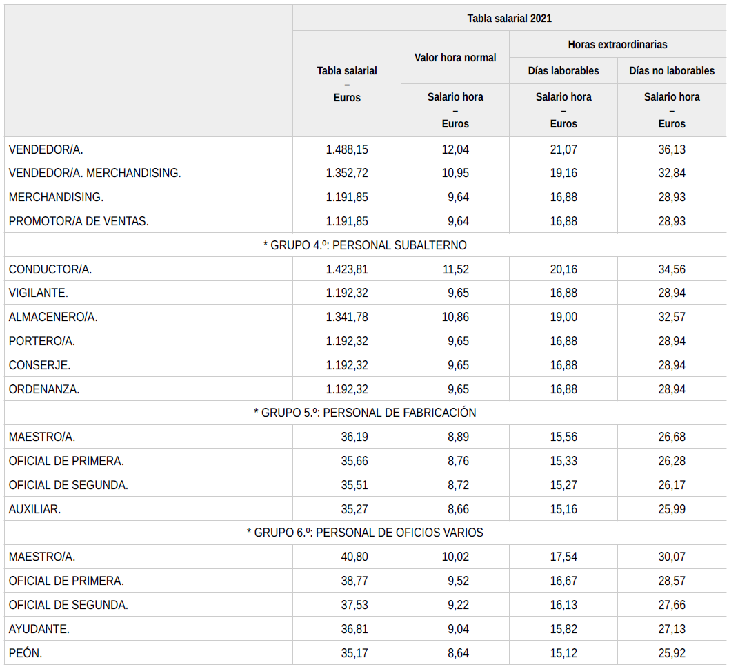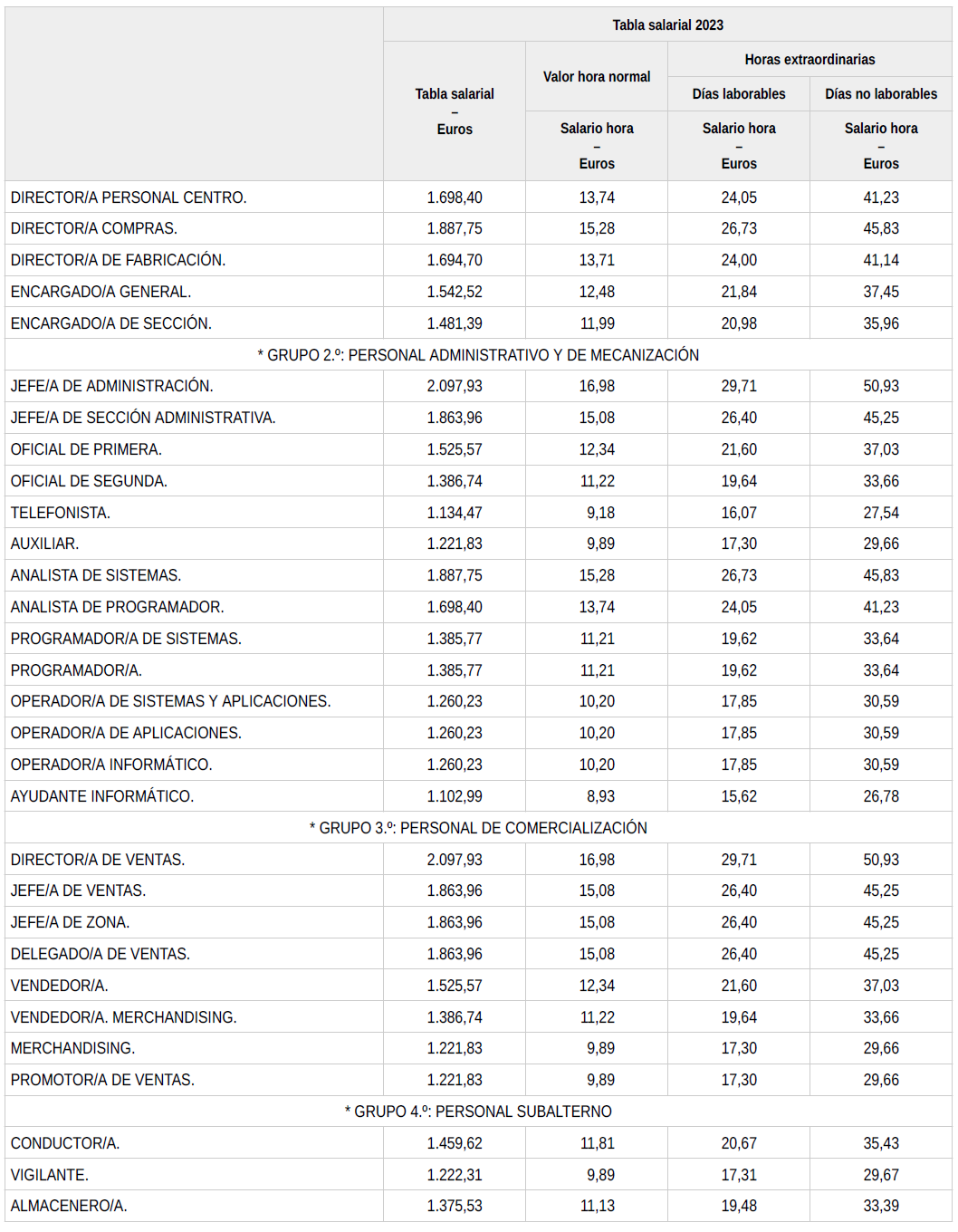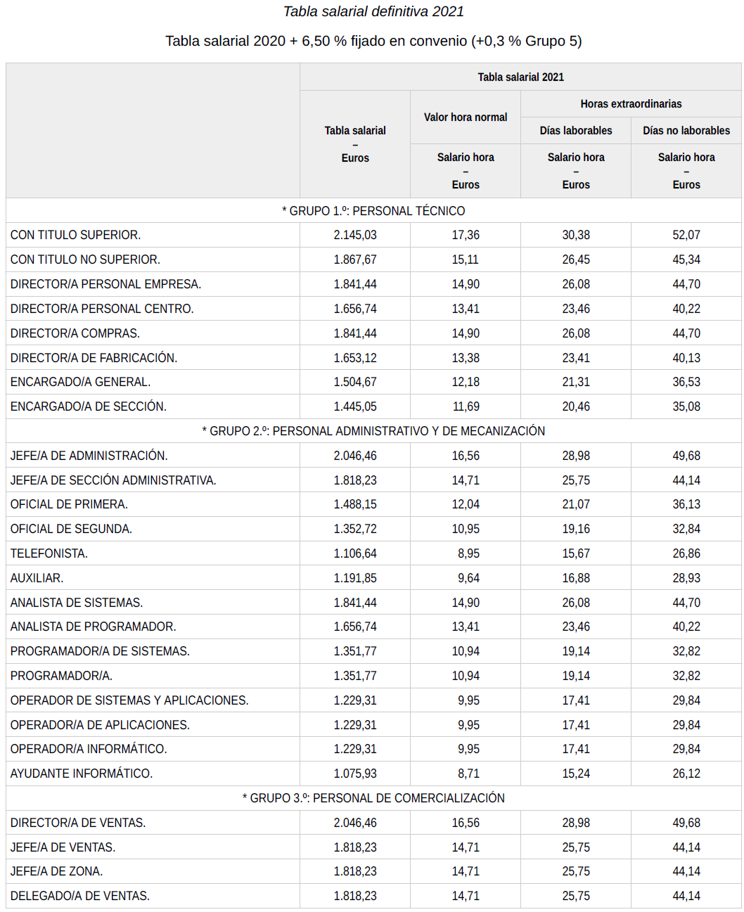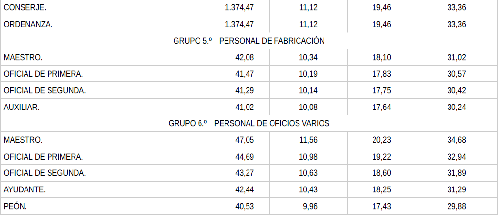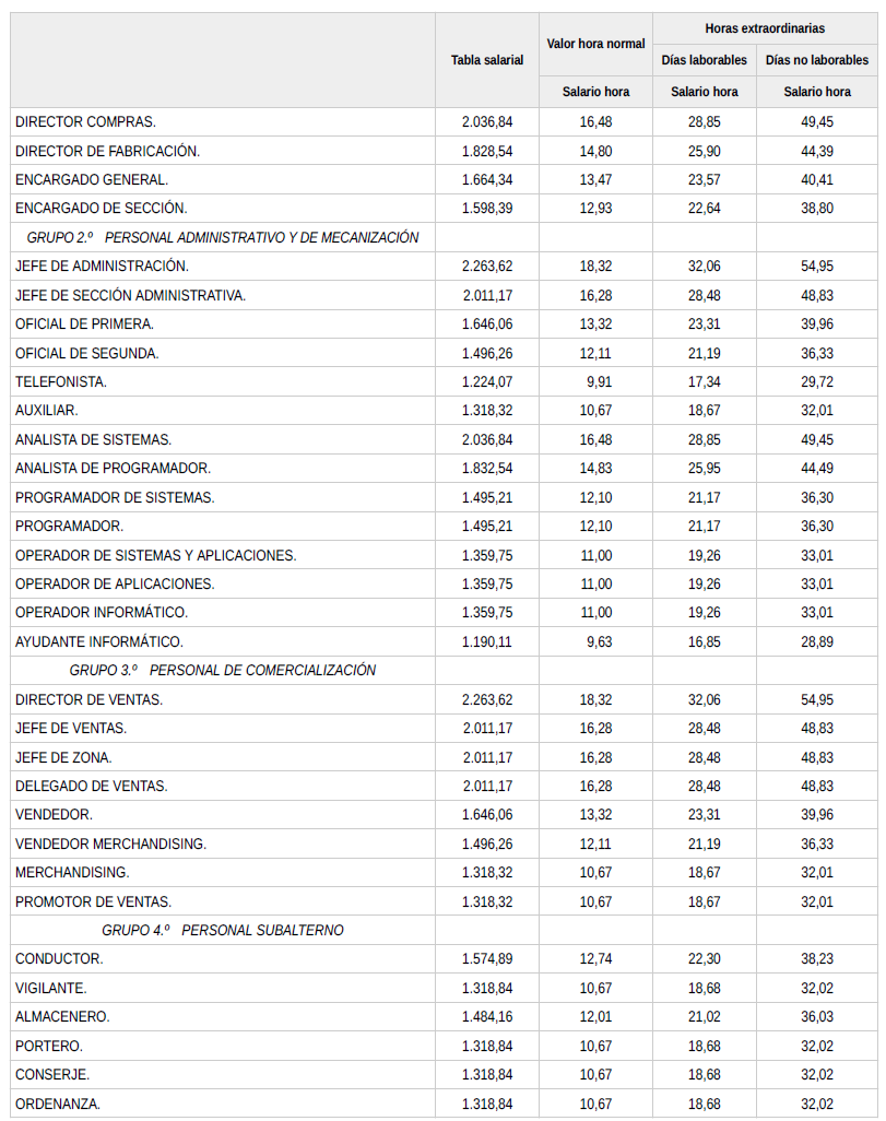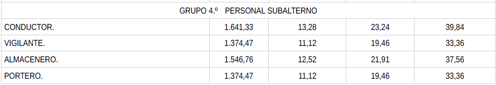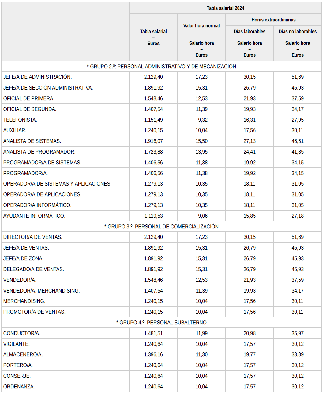 En base a lo anterior, se procede a revisar, aprobar y firmar las tablas salariales definitivas para el año 2024 y que se incorporan a la presente acta. Dichas tablas salariales ya incluyen aplicado el +0,3 % adicional correspondiente al grupo 5.