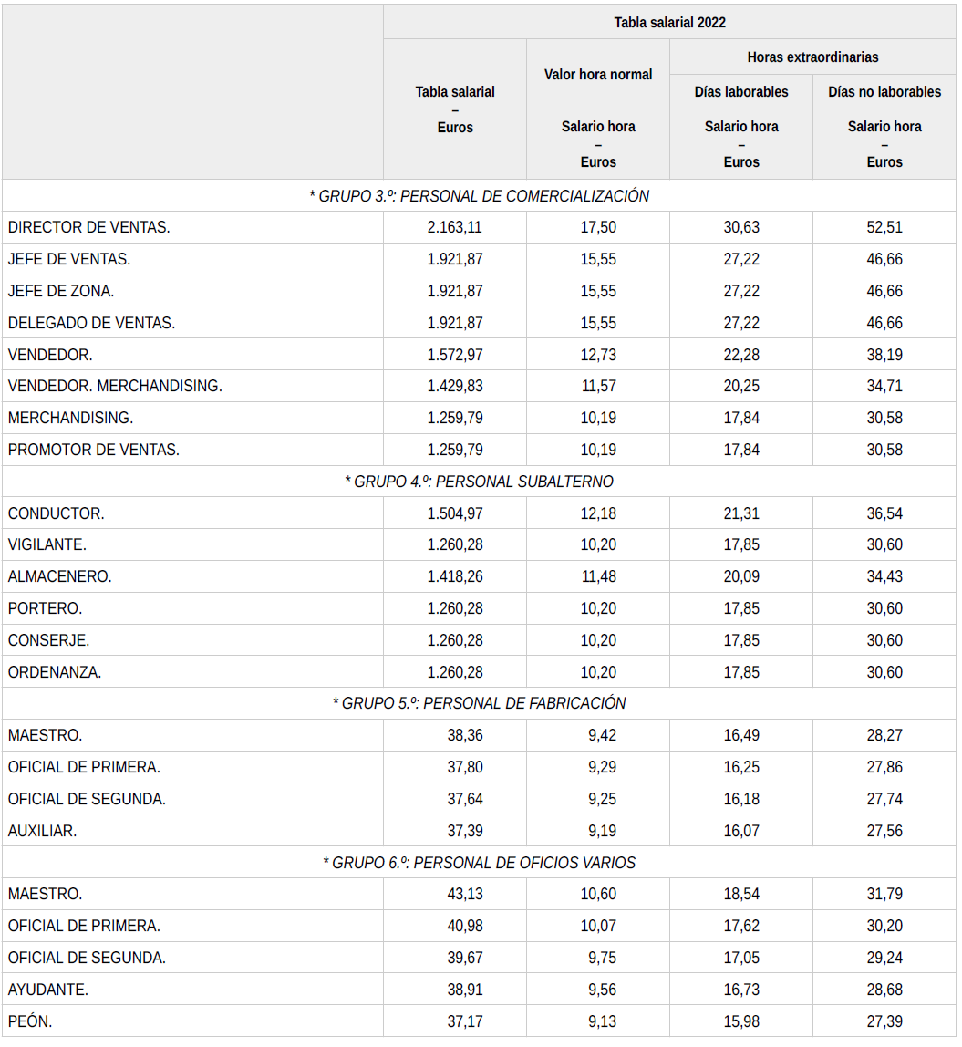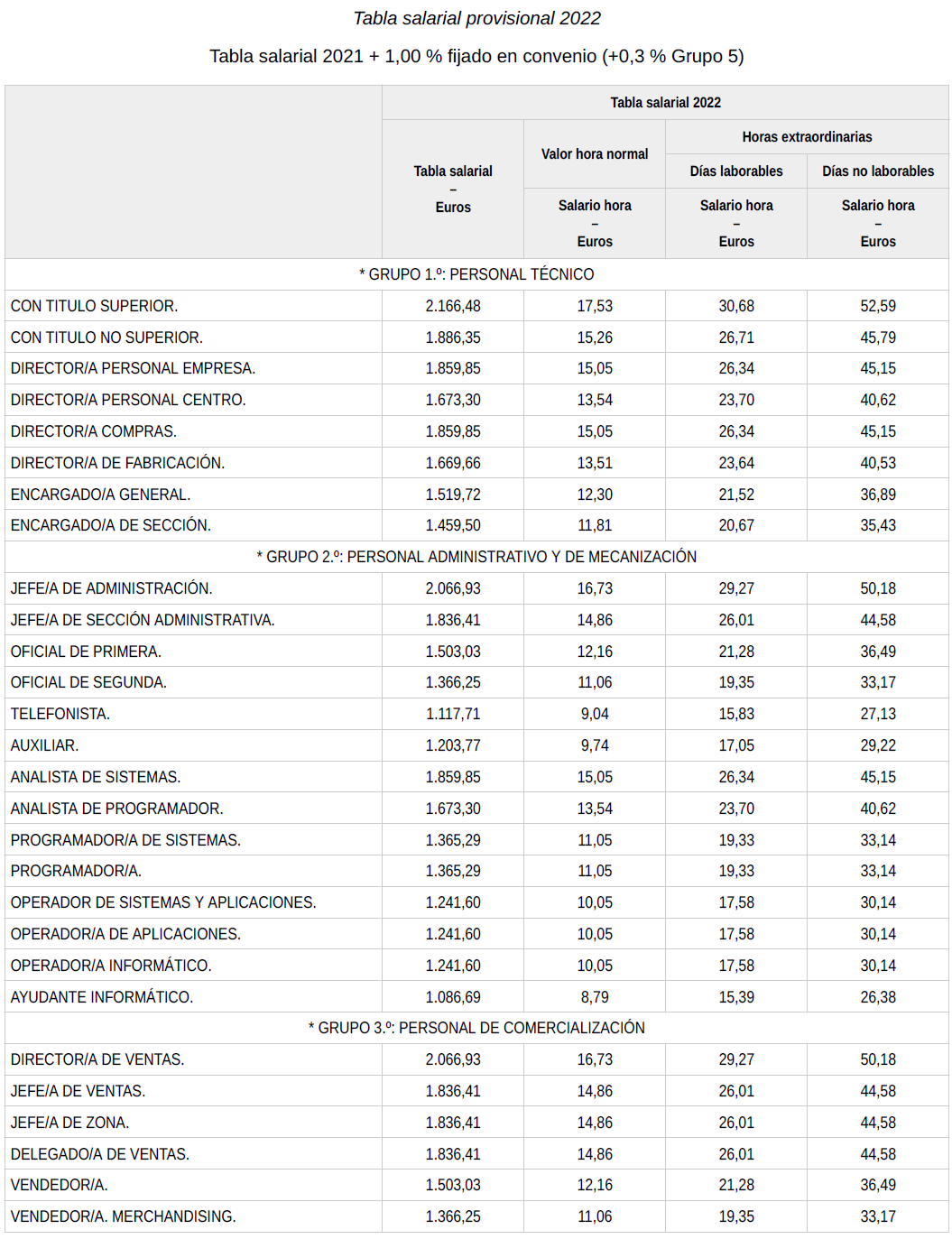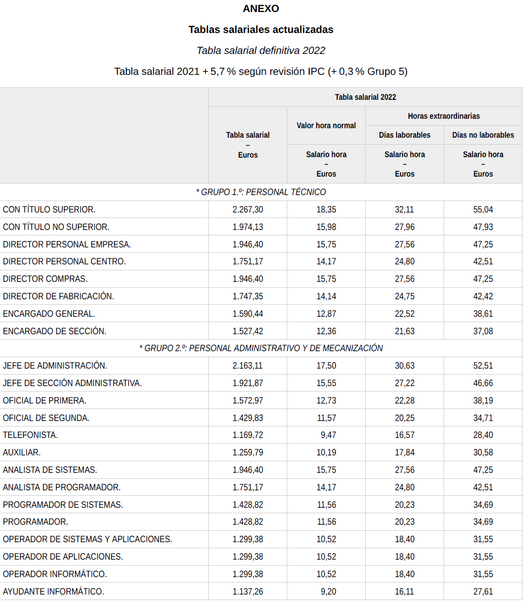En base a lo anterior, se procede a revisar, aprobar y firmar las tablas salariales definitivas para el año 2022, así como las nuevas tablas salariales provisionales para el año 2023 y 2024, que se incorporan a la presente acta. Dichas tablas salariales, ya incluyen aplicado el + 0,3 % adicional correspondiente al grupo 5.