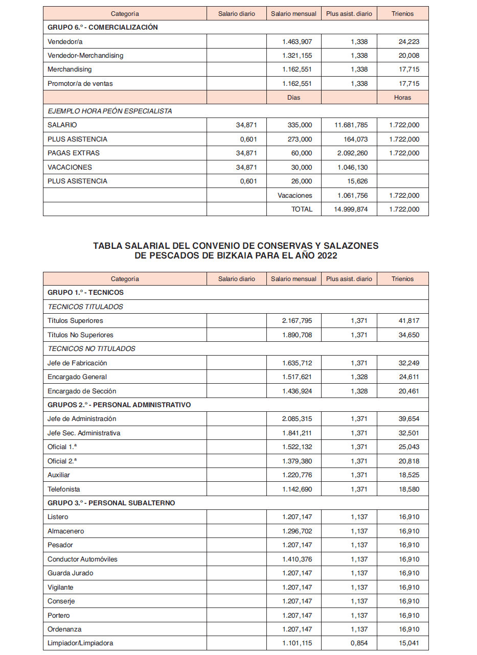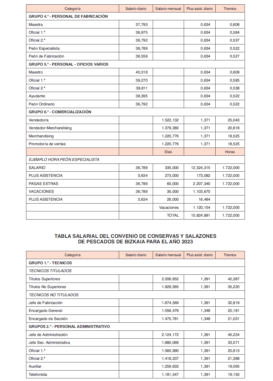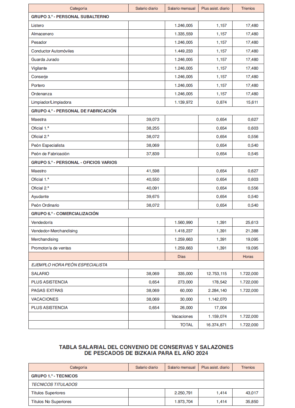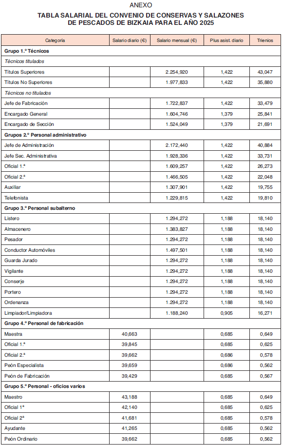«Se aprueban las tablas salariales del Convenio colectivo de Conservas y Salazones de Pescado de Bizkaia que, firmadas, se adjuntan como anexo a la presente acta, resultantes de la aplicación del incremento salarial para 2025 en función de la evolución del IPC, previsto en el artículo 35 del Convenio colectivo de Conservas y Salazones de Pescado de Bizkaia, con efectos desde el 1 de enero de 2025.