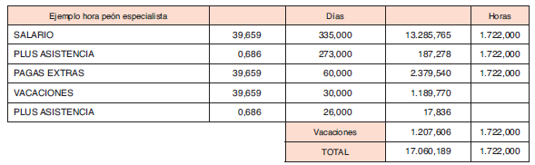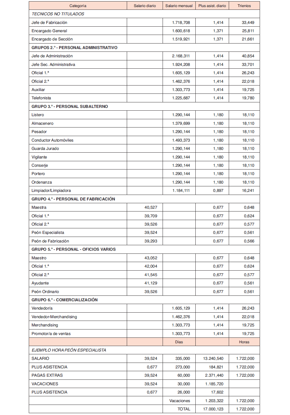 Los nuevos importes se han calculado teniendo en cuenta que los IPC de 2022 y 2023 han sido 5,7% y 3,1% respectivamente, resultando el sumatorio de los IPC de los años 2020-2023 14,8% (por encima del 14,39%), de manera que aplicado dicho porcentaje sobre las tablas del Peón Especialista del año 2020 (14.860,82 euros/anuales), la suma del salario base y del plus de asistencia de esta categoría se ha visto incrementada hasta 17.060,189 euros/anuales (sin exceder el tope máximo salarial fijado de 17.250 euros/anuales), aplicándose al resto de las categorías profesionales de forma lineal el mismo incremento salarial resultante (60,189 euros/anuales sobre los 17.000 acordados para el año 2024 por los mismos conceptos).