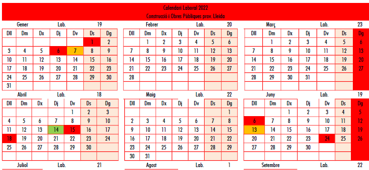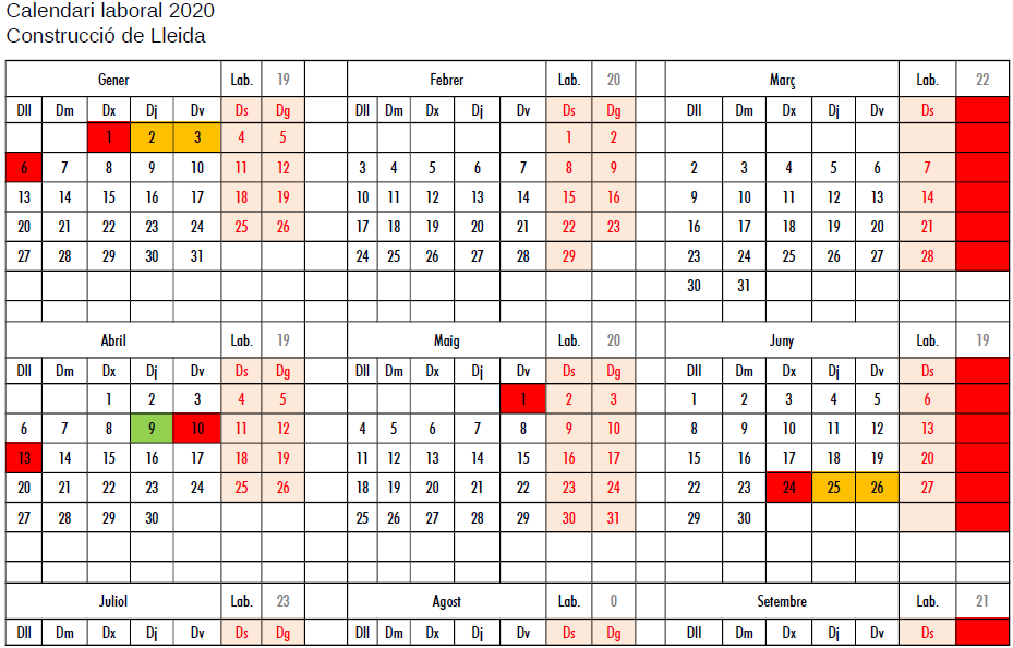 Acord de la Comissió Paritària del Conveni Col·lectiu de treball del sector de la construcció de les comarques de Lleida, relatiu a l’aprovació del calendari laboral per a l’any 2020.
