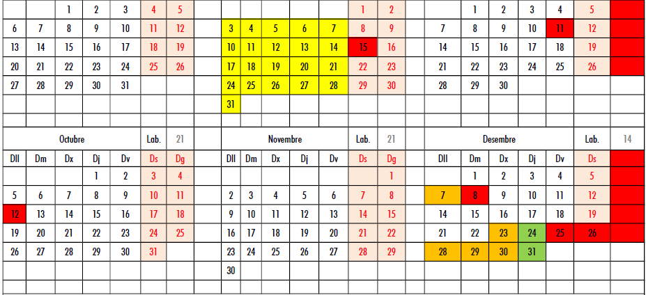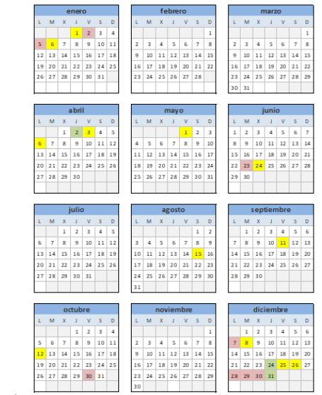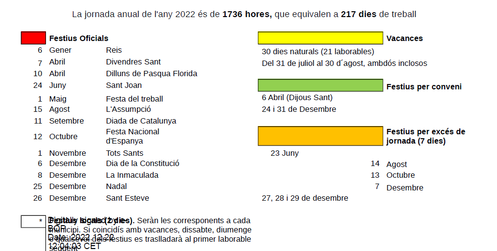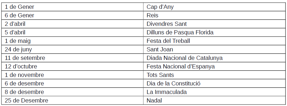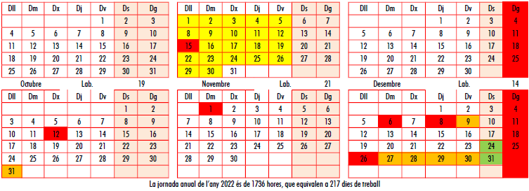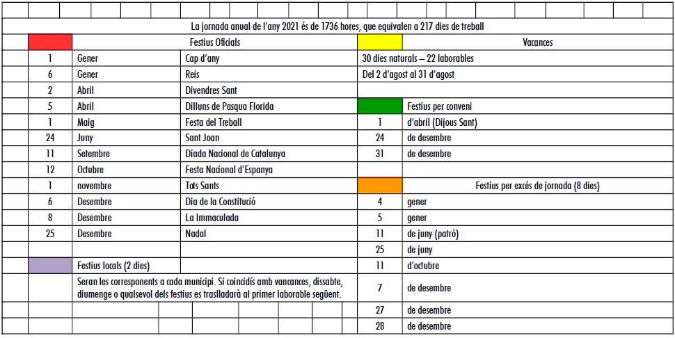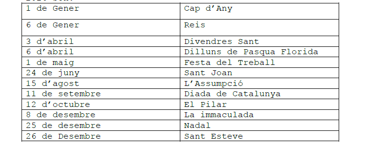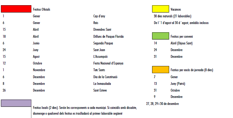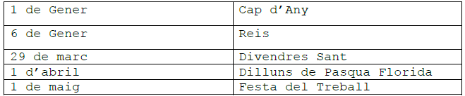 La jornada laboral festiva segons conveni col·lectiu serà els dies 2 d’abril, 24 i 31 de desembre.