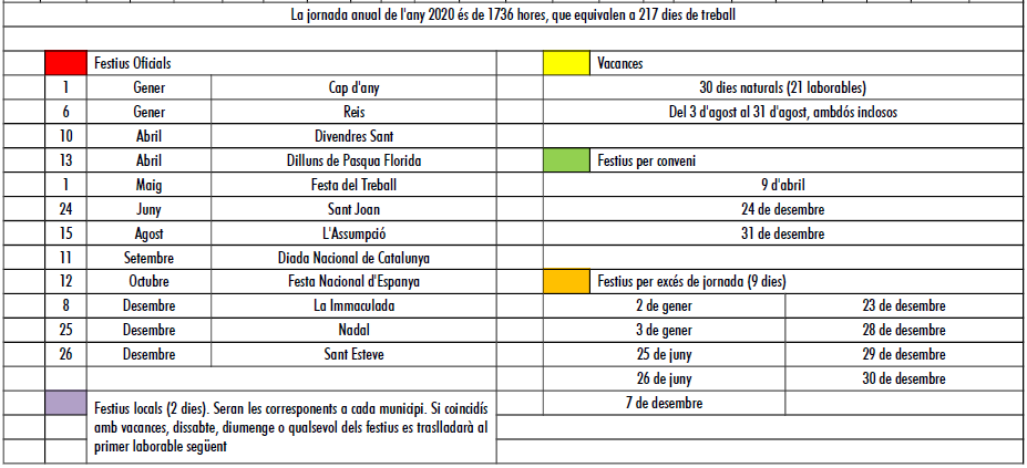 La jornada laboral per a l’any 2020 serà de 40 hores setmanals de dilluns a divendres amb un màxim de 1736 hores anuals de treball efectiu.