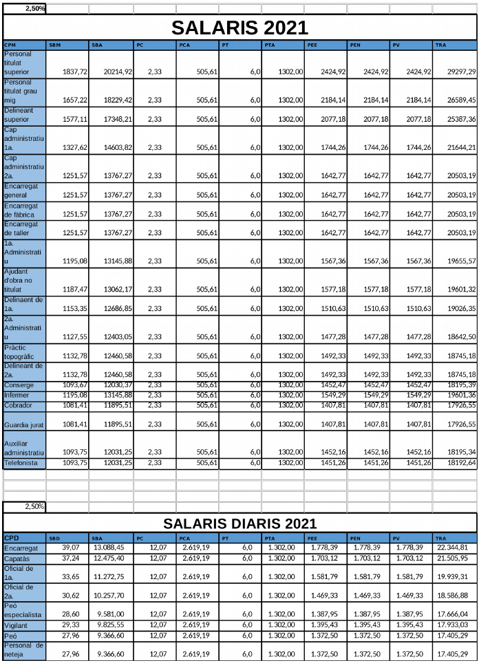Per l’any 2021 s’aplicarà amb efectes de l’1 de gener un increment salarial del 2,50%.