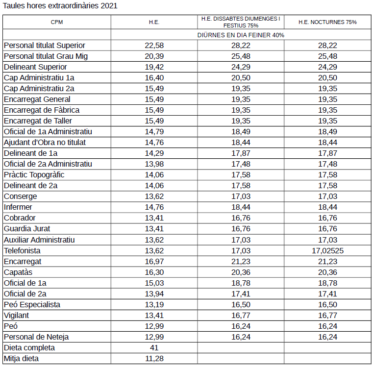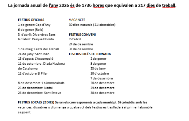 La jornada laboral per a l’any 2026 serà de 40 hores setmanals de dilluns a divendres amb un màxim de 1736 hores anuals de treball efectiu.