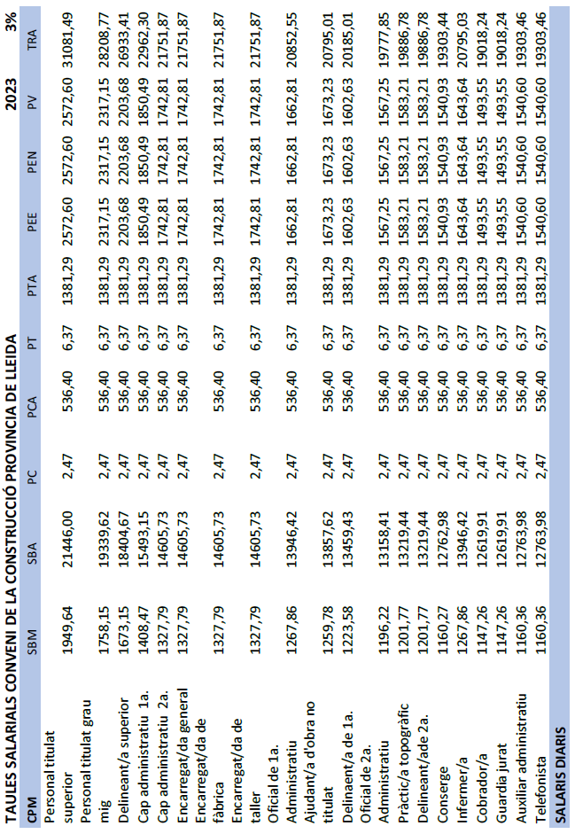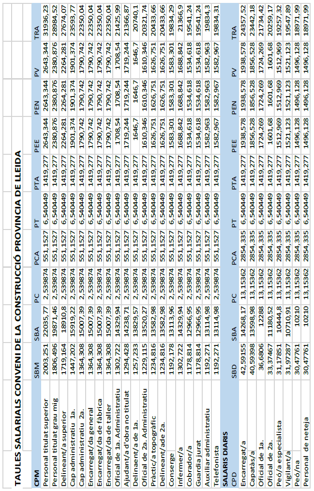Taules salarials per a l’any 2024 del Conveni col·lectiu de treball del sector de la construcció de les comarques de Lleida.