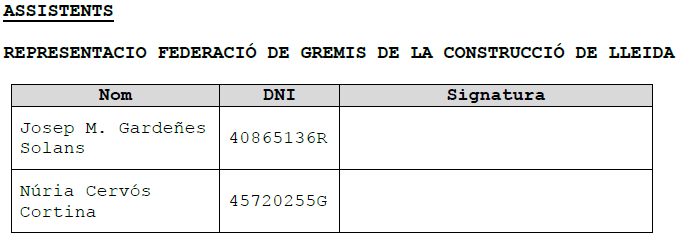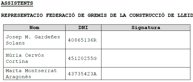 A Lleida, essent les 10.30 hores del dia 20 d’octubre de 2023 es reuneixen a la Federació de Gremis de la Construcció de Lleida, Rambla Ferran, número 32 de Lleida les següents persones anteriorment esmentades, havent estat convocades en temps i forma.
