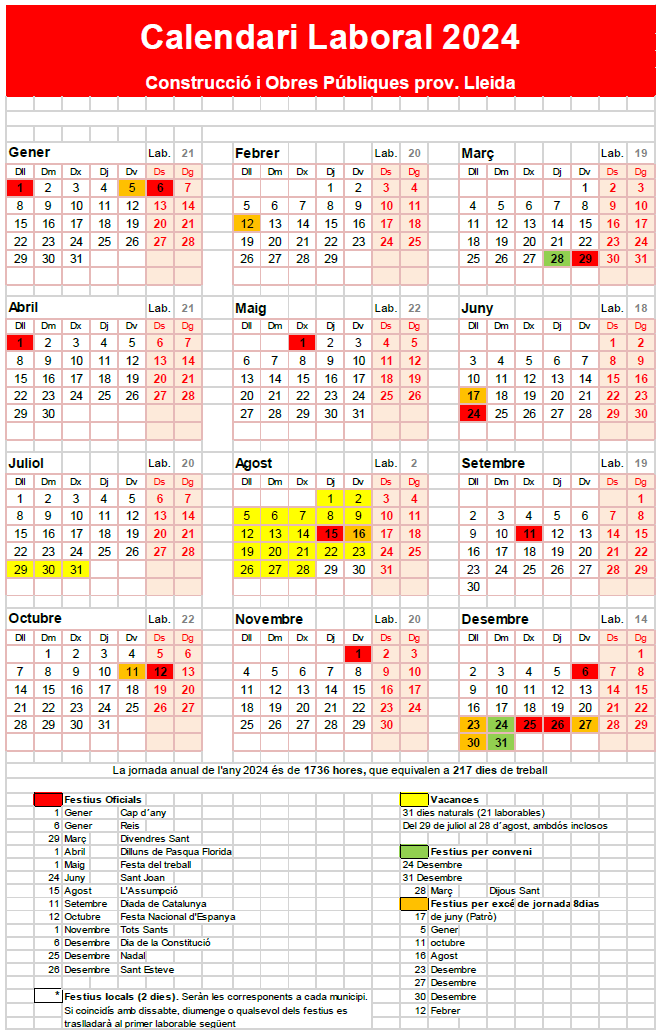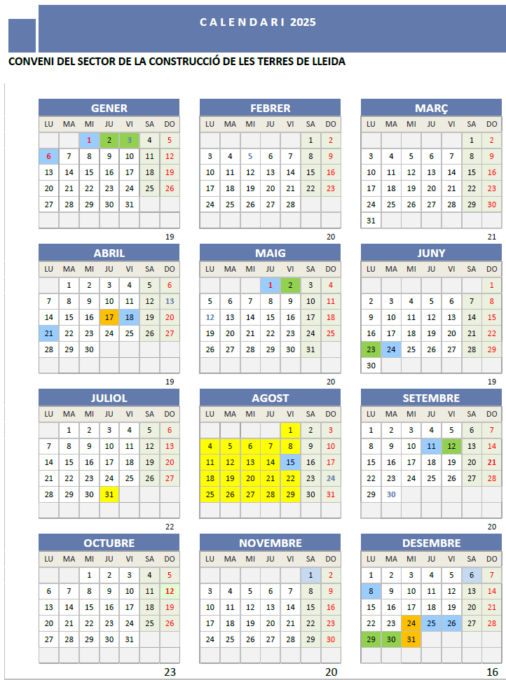 Com a únic punt de l’ordre del dia i segons estableix el Conveni col·lectiu del sector de la Construcció de la Província de Lleida, aquesta Comissió, acorda aprovar el calendari laboral per a l’any 2025 en els següents termes: