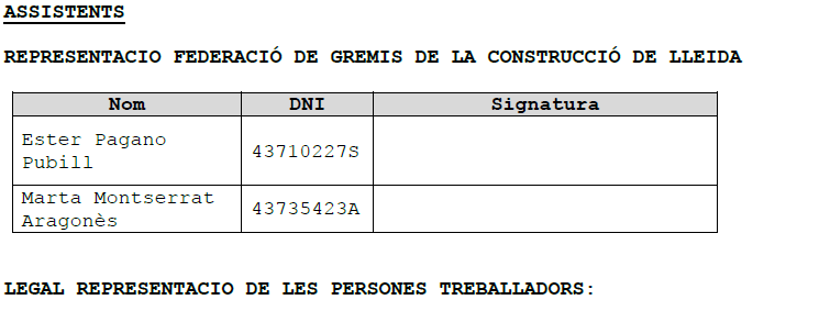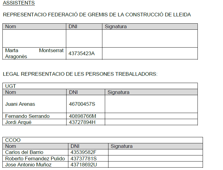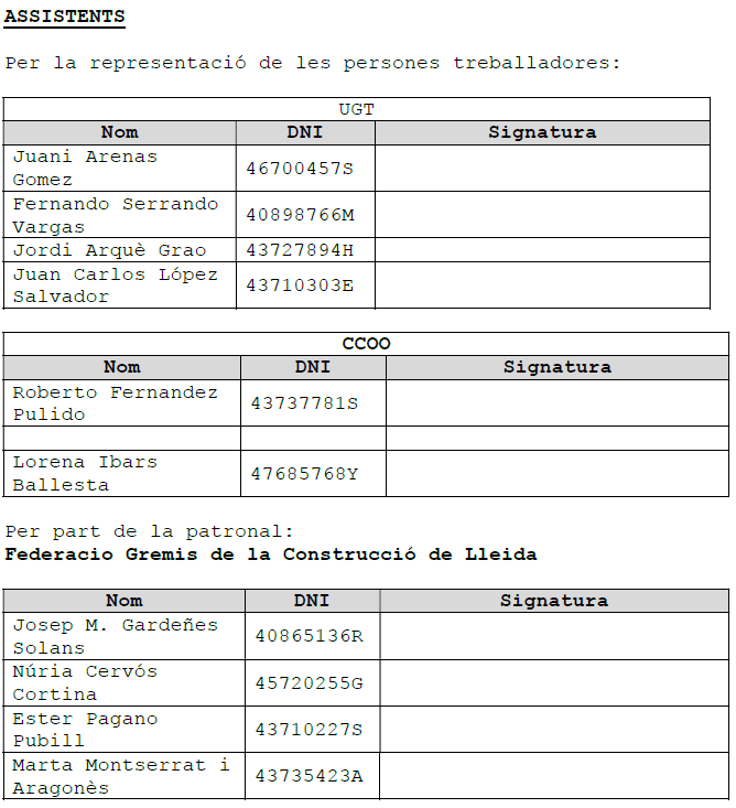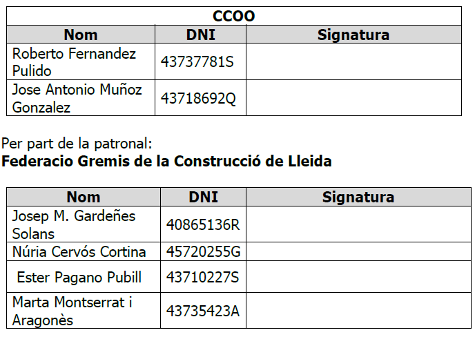 A Lleida, essent les 10.00 hores del dia 7 d’octubre de 2025 es reuneixen a la Federació de Gremis de la Construcció de Lleida, Rambla Ferran, número 32 de Lleida les següents persones anteriorment esmentades, havent estat convocades en temps i forma, amb la representació que cadascuna d’elles ostenta, als efectes de constituir la Comissió Paritària del Conveni Col·lectiu del sector de la Construcció de la província de Lleida.