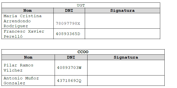 S’autoritza i delega en la persona de la Secretària de la Comissió a la Sra. Marta Montserrat la remissió de les actes de la susdita Comissió, a la Direcció General de Relacions Laborals i Qualitat en el Treball del Departament d’Empresa i Ocupació de la Generalitat Catalunya, als efectes escaients, així com per dur a terme els tràmits relatius a la presentació, registre, dipòsit i publicació de les taules salarials aprovades i taules amb la contribució empresarial a pla de pensions per als anys 2025 i 2026 en el Diari Oficial de Generalitat (DOGC) O Butlletí Oficial de la Província (BOP) així com realitzar qualsevol gestió i tramitació de caire administratiu que es requereixi en el si de la Comissió.