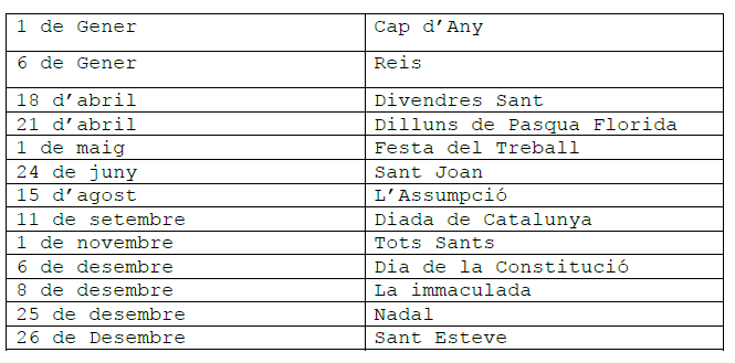 A més de les esmentades festes s’hauran d’incloure les dues festes locals del respectiu municipi. En el supòsit que les festes locals que s’han fixat, coincideixin amb dissabte, diumenge, festiu per conveni i/o festiu oficial, es traslladarà al primer dia laborable següent.