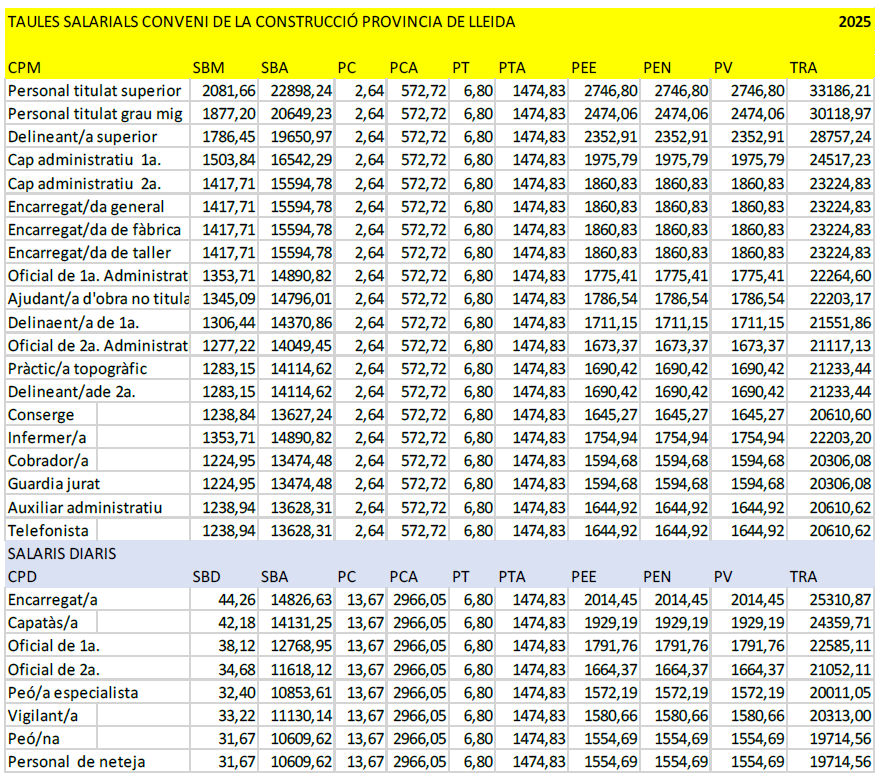 ACTA DE LA COMISSIÓ NEGOCIADORA DEL CONVENI COL·LECTIU DE TREBALL DEL SECTOR DE LA CONSTRUCCIÓ DE LES TERRES DE LLEIDA RELATIU A LES TAULES SALARIALS PER ALS ANYS 2025 i 2026 I CONTRIBUCIÓ AL PLA DE PENSIONS EN EL SECTOR DE LA CONSTRUCCIÓ (PPSC) PER ALS ANYS 2025 i 2026.