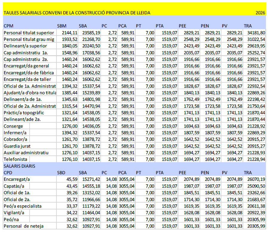 Tots els presents constaten que havent estat signat un increment salarial de 3% per a l’any 2026 per part de la Confederación Nacional de la Construcción, CC.OO de Construcción y Servicios y UGT-FICA Federación de Industria, Construcción i Agro, les Taules Salarials corresponents a l’any 2025 del Conveni de Lleida seran incrementades en un 3%, a partir de l’1 de gener de 2026.