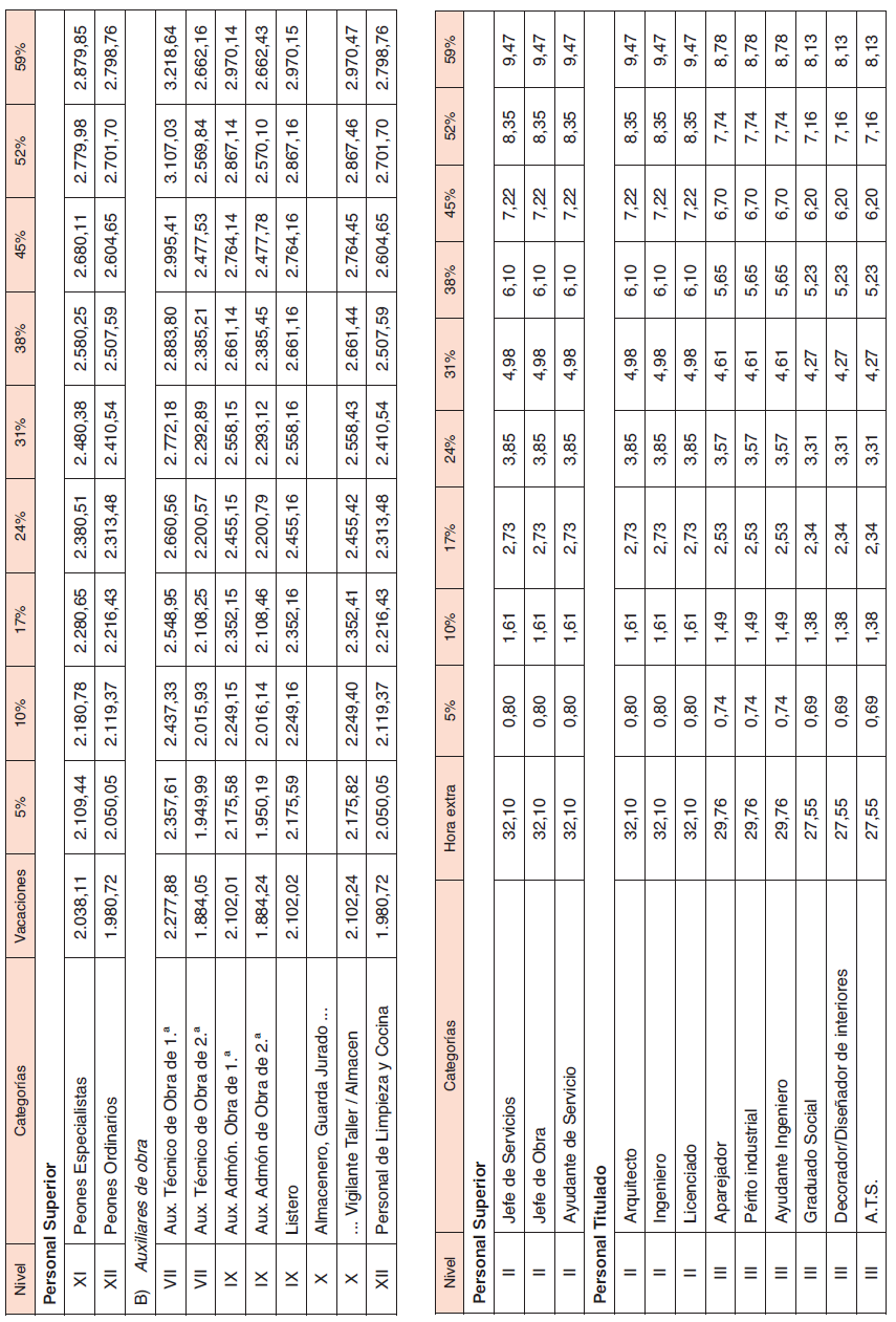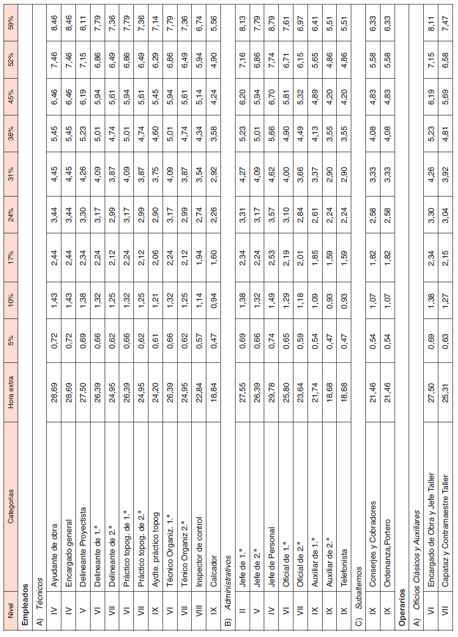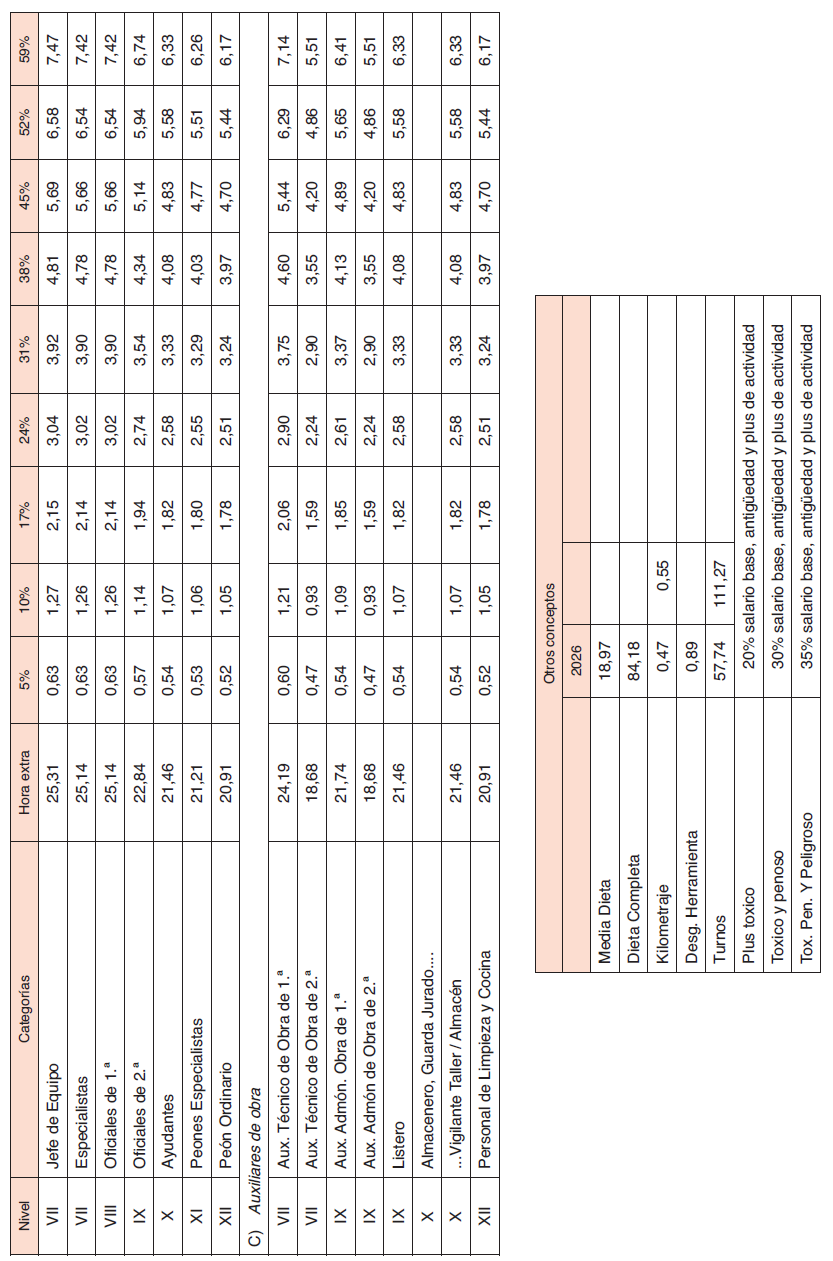 Reunidas en Bilbao, en la sede del Consejo de Relaciones Laborales, la organización sindical CCOO que ostentan el 100% de la representación de la parte sindical en la Comisión Paritaria del convenio colectivo del sector de la Construcción de Bizkaia y las organizaciones empresariales ASCOBI-BIEBA, Asociación Vizcaína de Excavadores (AVE-BIE) y Asociación de Maestros Pintores de Bizkaia (AMPV) que ostentan el 100% de la representación empresarial en dicha comisión, acuerdan unánimemente la aprobación de las tablas salariales de la Construcción de Bizkaia para el año 2026, dando cumplimiento a lo previsto en el artículo 25 del convenio colectivo sectorial en base a lo siguiente: