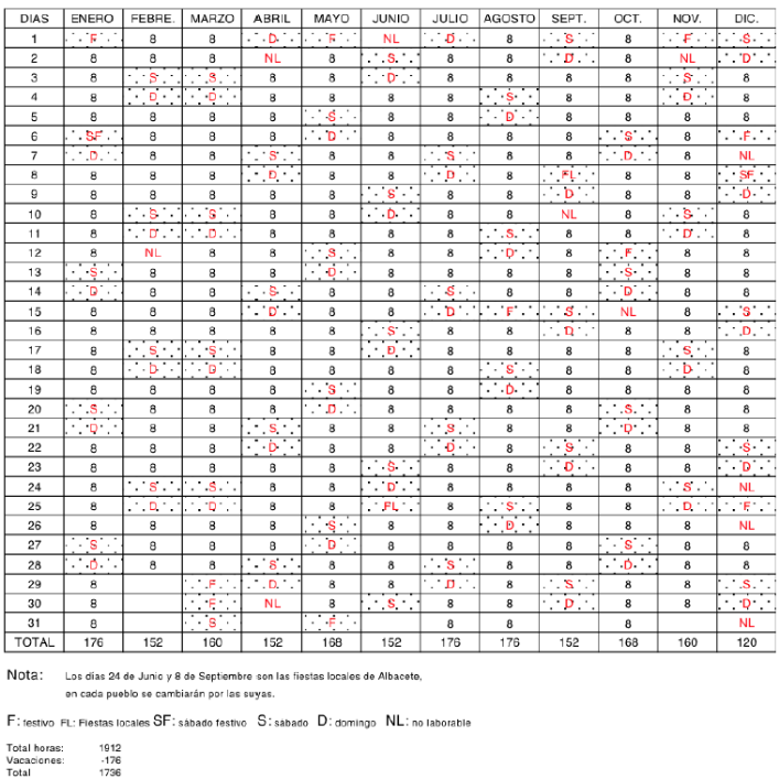 Vista: El acta de fecha 12 de diciembre de 2023, suscrita por la Comisión Negociadora del Convenio Colectivo de «Construcción y Obras Públicas» de la provincia de Albacete, con código número 02000045011981, en la que se acuerda el calendario laboral para el año 2024, y de conformidad con lo dispuesto en el artículo 90.3 del texto refundido de la Ley del Estatuto de los Trabajadores, aprobado por Real Decreto Legislativo 2/2015 de 23 de octubre, artículo 8.3 del Real Decreto 713/2010, de 28 de mayo, sobre registro y depósito de convenios y acuerdos colectivos de trabajo, en el Decreto 103/2023, de 25 de julio, por el que se establece la estructura orgánica y se fijan las competencias de los órganos integrados en la Consejería de Economía, Empresas y Empleo y en el capítulo II del Decreto 99/2013, de 28 de noviembre, por el que se atribuyen competencias en materia de relaciones laborales.