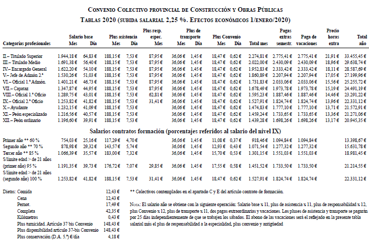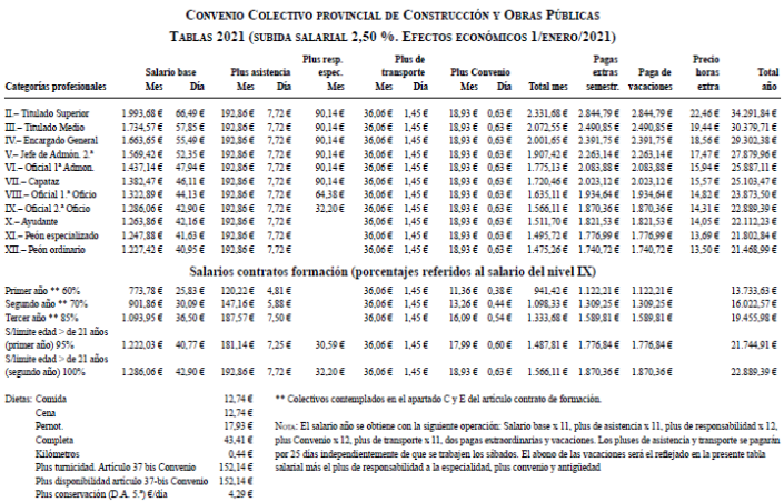 De acuerdo con las fórmulas de devengo, la remuneración bruta anual vendrá dada por la siguiente fórmula, teniendo como referencia las tablas salariales del año 2021 del Convenio de Construcción y Obras Públicas de la provincia de Albacete publicadas en el BOP n.º 32 de 15 de marzo de 2019.
