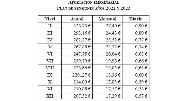 Se acuerdan los importes de las contribuciones empresariales al plan de pensiones para los años 2022 y 2023 que tendrán que aplicarse dentro de los tres meses siguientes a la entrada en vigor del presente acuerdo.