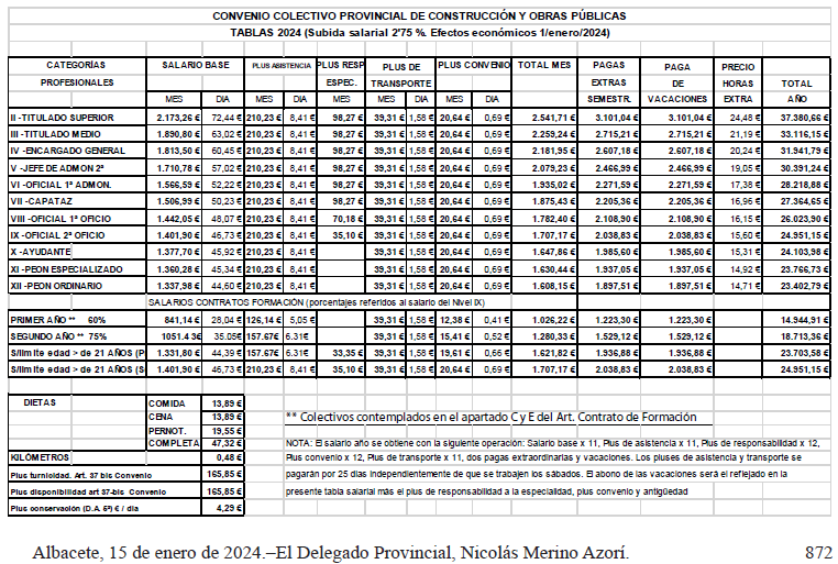 Vista: El acta de fecha 19 de diciembre de 2023, suscrita por la Comisión Negociadora del Convenio Colectivo de «Construcción y Obras Públicas» de la provincia de Albacete, con código número 02000045011981, en la que se acuerda actualizar las tablas salariales para el año 2024.