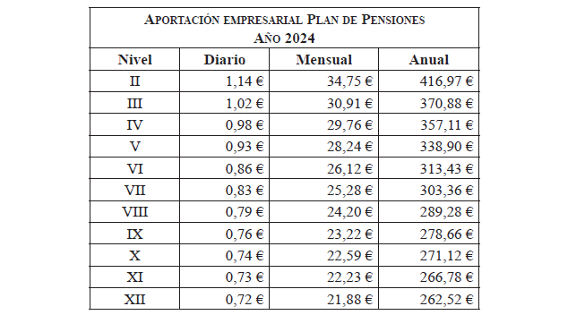 Las aportaciones empresariales al Plan de Pensiones para el año 2024, resultan de la aplicación del 1 % de los conceptos salariales de las tablas del Convenio del año 2021 más un 0,25 % del importe de las tablas salariales del año 2023, publicadas en el BOP n.º 41 de 10 de abril.