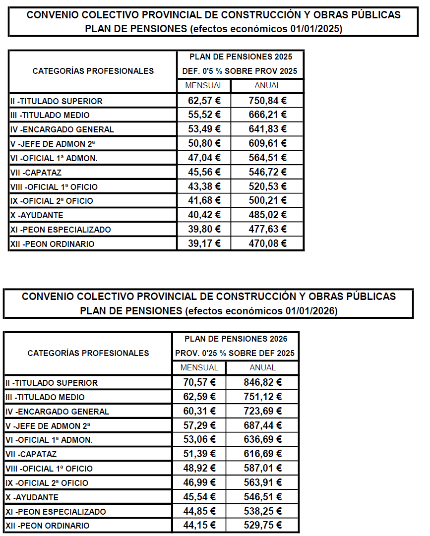 Segundo: Incrementos salariales para 2025 y 2026: Establecer y firmar las tablas salariales para los años 2025 (incremento del 3,5 % sobre la tabla salarial definitiva de 2024 y aportación del 0,5 % de la misma al plan del pensiones) y 2026 (incremento del 3 % sobre la tabla salarial de 2025 y aportación del 0,25 % de la misma al Plan de Pensiones), con efectos retroactivos a 1 de enero de cada año respectivo, aplicando con ello los incrementos establecidos y acordados en la reunión de la Comisión Negociadora del VII Convenio General del Sector de la Construcción mantenida el 04 de noviembre de 2025. Se anexan al presente acta las tablas resultantes.