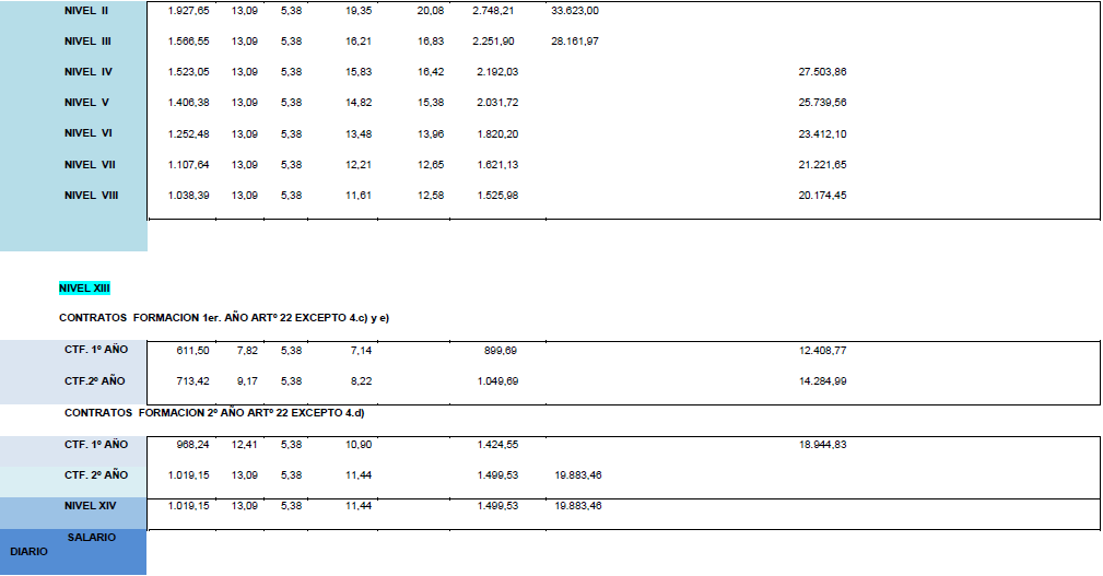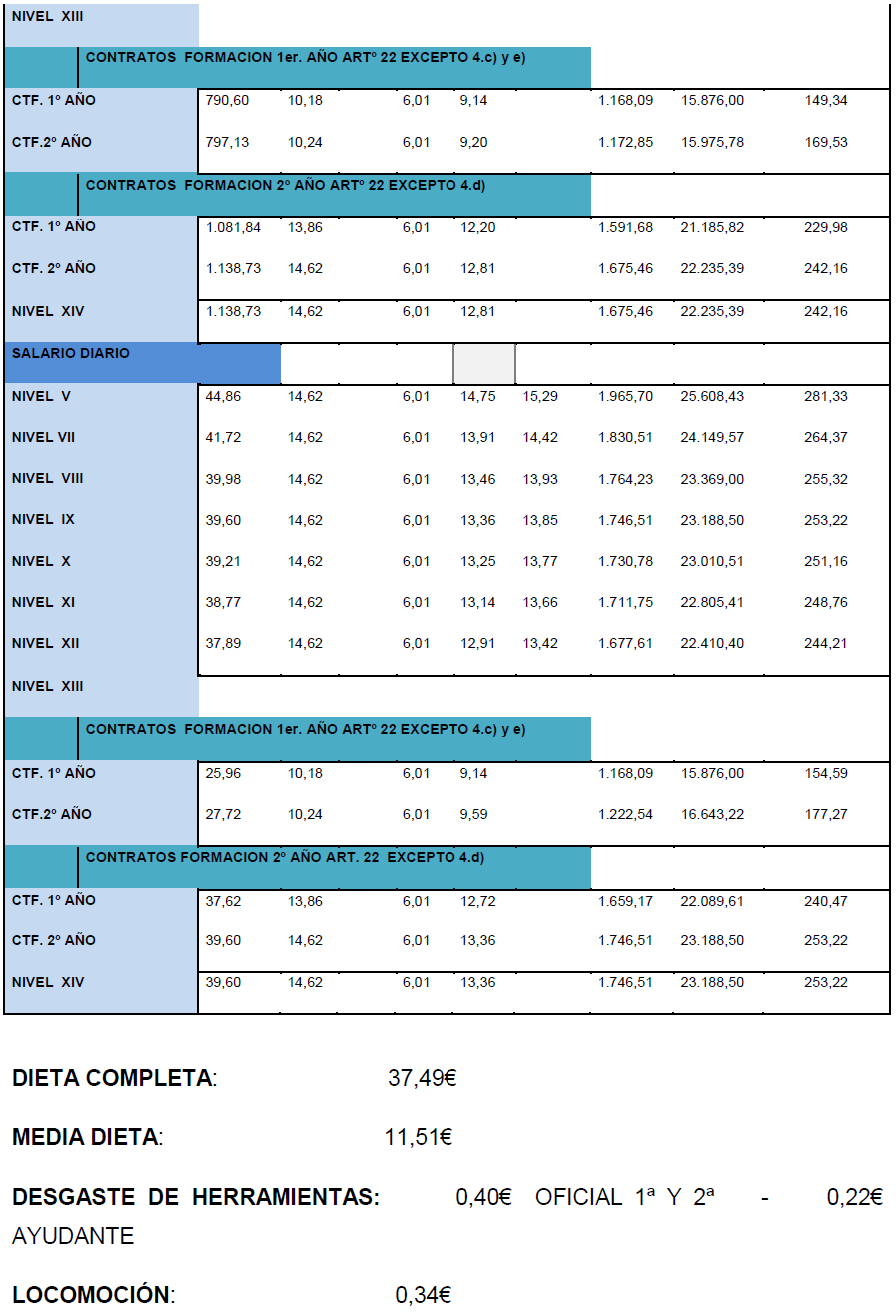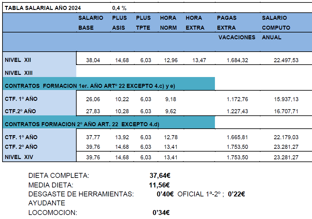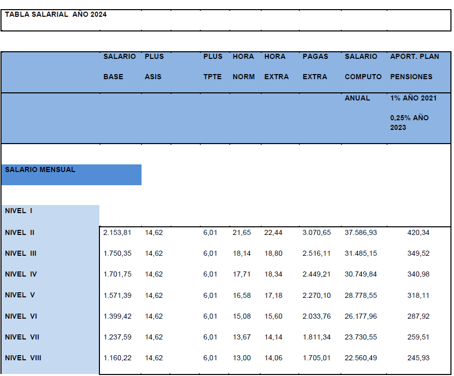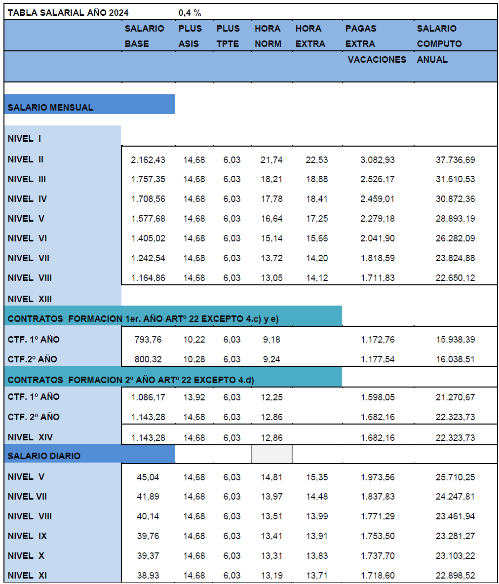 La tabla salarial de aplicación para el año 2025, calculándose con la tabla base 2024 y con efectos desde el 01/01/2025, es la siguiente:.