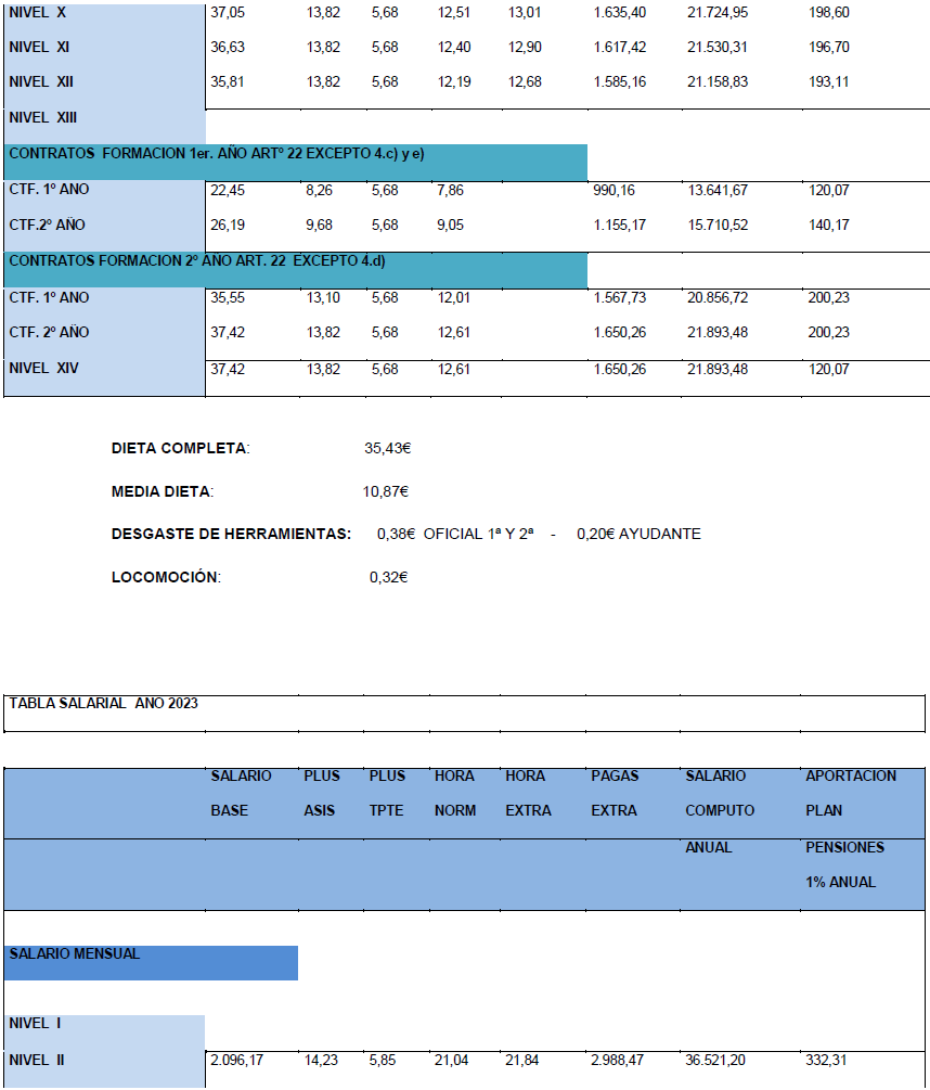Asimismo se aprueba de la contribución empresarial al plan de pensiones del sector de la construcción para el año 2024 que figura en este acta, todo ello según lo indicado en el artículo 56 del VII Convenio General del Sector de la Construcción (VII CGSC) publicado en el BOE 228 de 23 de septiembre de 2023 La tabla salarial de aplicación para el año 2.024, con efectos desde el 01/01/2024, es la siguiente: