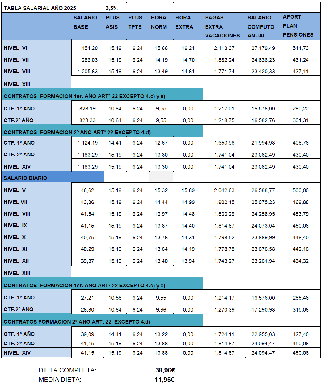 Las tablas salariales de 2025 se actualizarán conforme a lo establecido en el Acuerdo firmado de fecha 04 de noviembre de 2025, incrementándose en un 3’5 %. Los CF 1º año, art 22, excepto 4 c) de salario mensual y diario, se adaptarán al SMI vigente. La contribución al Plan de Pensiones para el año 2025, se obtendrá de añadir a la contribución al Plan de Pensiones del año 2024 el 0’50 %.