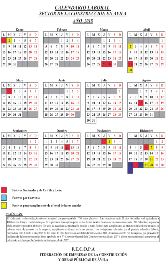 Primero. Se aprueba por unanimidad el Calendario Laboral de fiestas para el año 2023, correspondiente al Sector de la Construcción y Obras Públicas de Ávila y Provincia, quedando el cómputo anual de horas laborables para el año 2023 en 1.736.