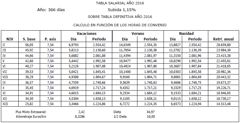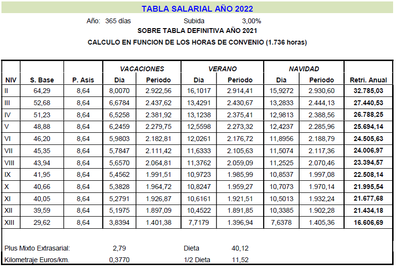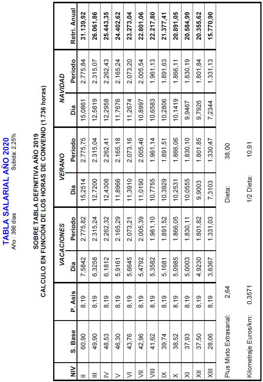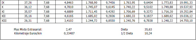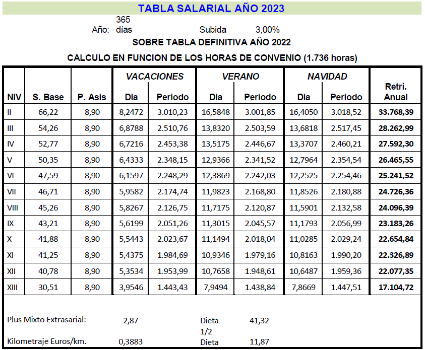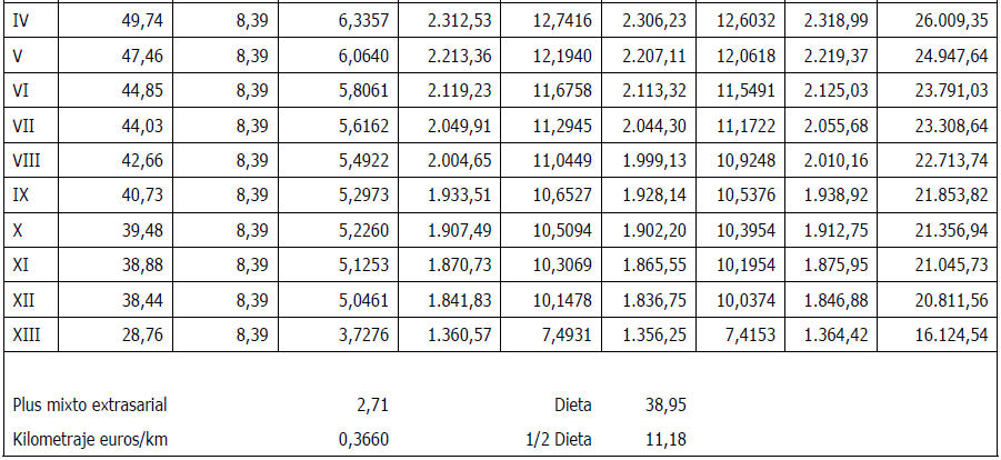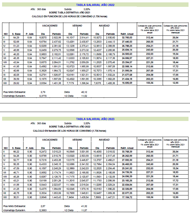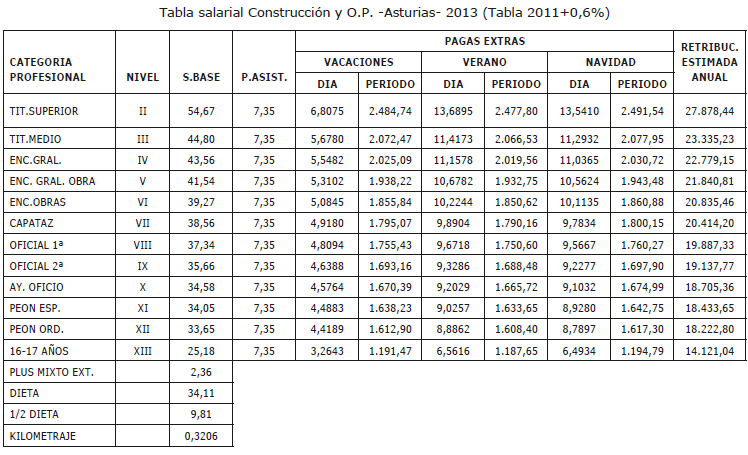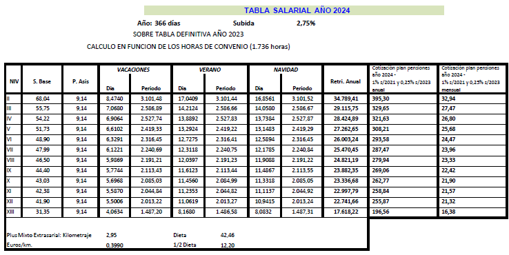 Es por ello que, en cumplimiento de lo anteriormente dispuesto, la Comisión Mixta de Interpretación del Convenio de Trabajo para la Construcción y Obras Públicas del Principado de Asturias han acordado las tablas salariales del año 2024 incluyendo igualmente en las mismas la contribución para dicho año al plan de pensiones sectorial y que se muestra a continuación: