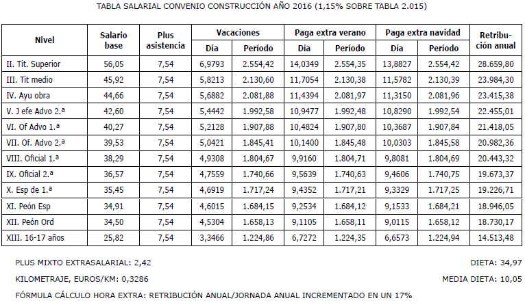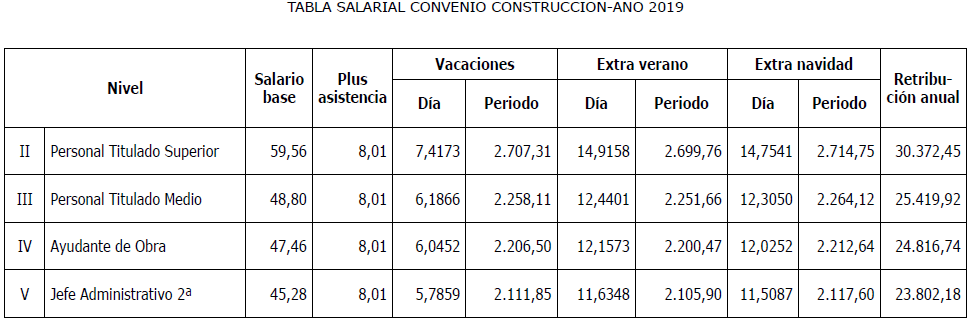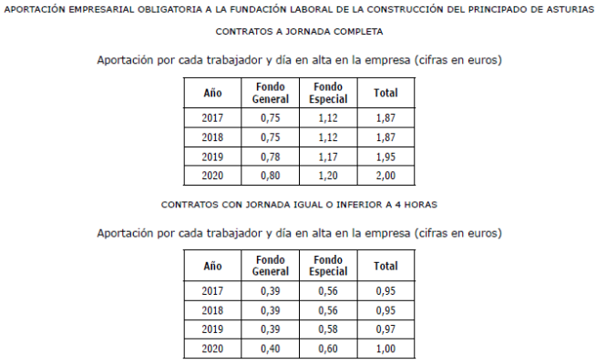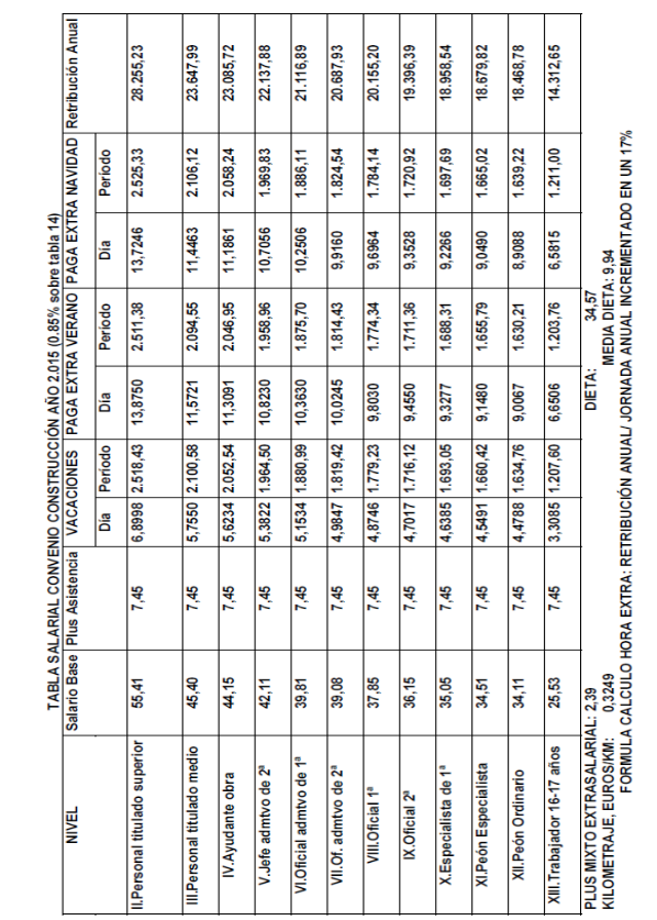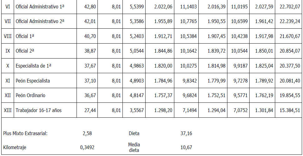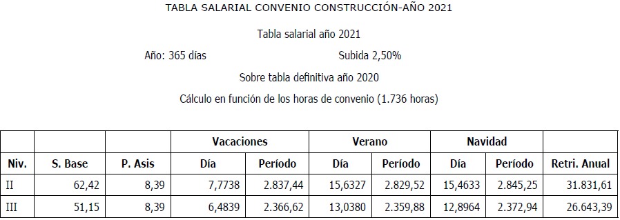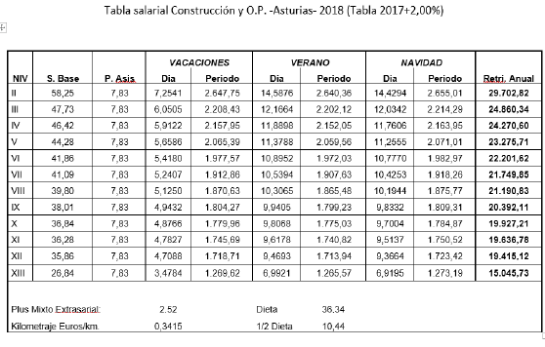 Es por ello, que en cumplimiento de lo anteriormente dispuesto, la Comisión Mixta de Interpretación del Convenio de Trabajo para la Construcción y Obras Públicas del Principado de Asturias han acordado las tablas salariales del año 2025 Y 2026 incluyendo igualmente en las mismas la contribución para dicho año al plan de pensiones sectorial y que se muestra a continuación: