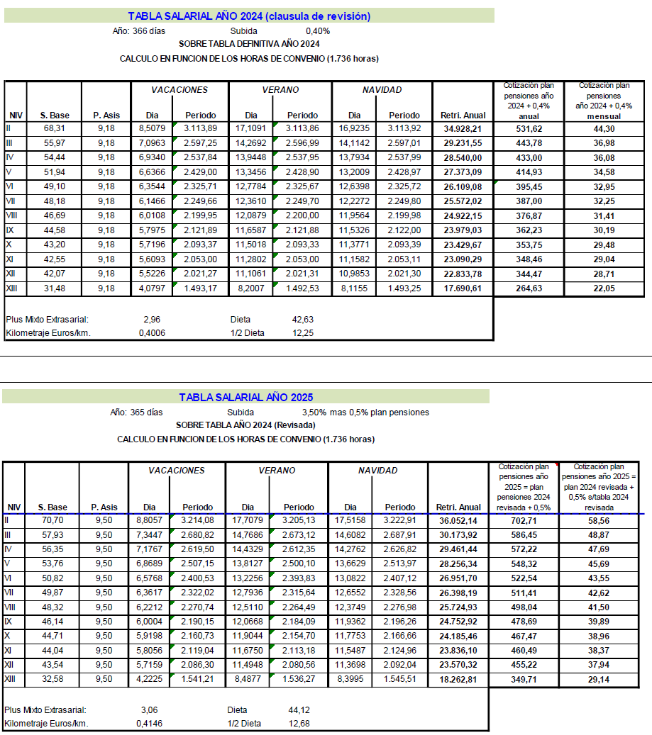 LAS PARTES FIRMANTES DEL VII CGSC HAN PACTADO QUE LAS TABLAS PROVINCIALES PARA EL 2025 SE OBTENDRÁN AL INCREMENTAR LAS TABLAS PROVINCIALES ACTUALIZADAS DEL AÑO 2024 EN UN 3,50 POR CIENTO Y LA CONTRIBUCIÓN AL PLAN DE PENSIONES PARA EL AÑO 2025 SE OBTENDRÁ DE AÑADIR A LA CONTRIBUCIÓN AL PLAN DE PENSIONES ACTUALIZADO DEL AÑO 2024 EL 0,50 POR CIENTO DEL IMPORTE DE LOS CONCEPTOS SALARIALES DE LAS TABLAS DE 2024 DEL CONVENIO COLECTIVO QUE RESULTE DE APLICACIÓN, EN LA FORMA PREVISTA EN EL ARTÍCULO 55 DEL VII CGSC.