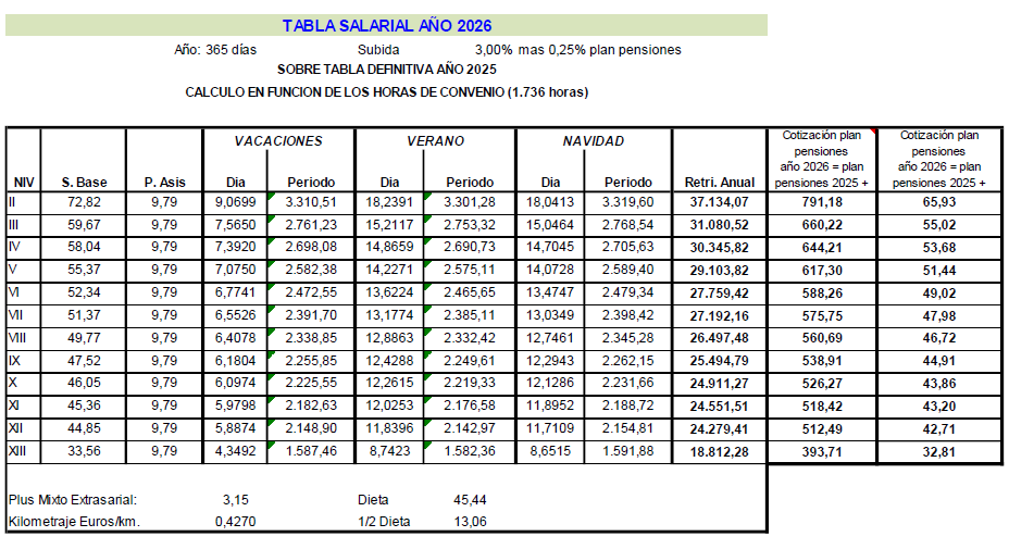 LAS TABLAS DEL AÑO 2026 SE TOMARÁN LAS TABLAS SALARIALES PROVINCIALES DE 2025 Y SE INCREMENTARÁ UN 3,0 POR CIENTO, LA CONTRIBUCIÓN AL PLAN DE PENSIONES PARA EL AÑO 2026 SE OBTENDRÁ DE AÑADIR A LA CONTRIBUCIÓN DEL AÑO 2025 UN 0,25 POR CIENTO SOBRE LOS CONCEPTOS SALARIALES DE 2025.